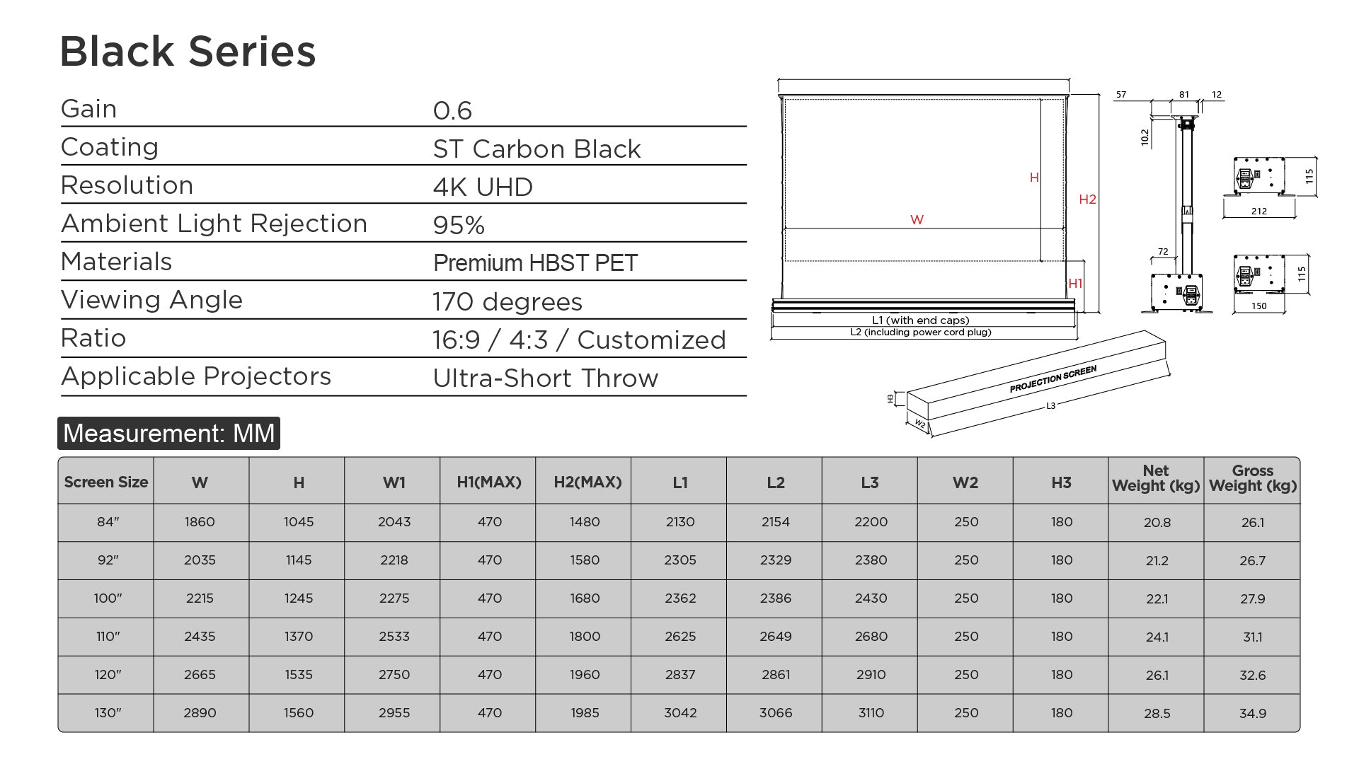 شاشة أرضية مرتفعة بمحرك مقاس 84"-130" NothingProjector Black Series ALR + صينية انزلاق ذكية (مجموعة)