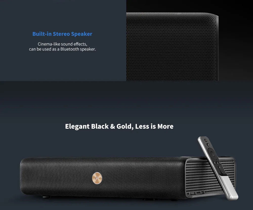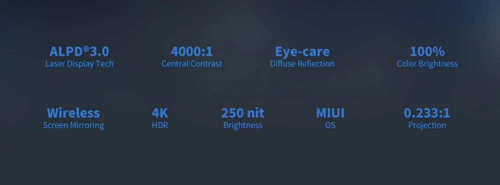 The Fengmi Wemax A300 4K Laser Projector has a brightness of 2000 ANSI lumens and uses ALPD® 3.0 laser light source technology for high brightness, accurate color reproduction, and high contrast ratio. It supports 4K Ultra HD resolution (3840 x 2160 pixels) with a throw ratio of 0.233:1, allowing it to project a large screen of 80 to 150 inches at a distance of 14 to 50 cm from the screen. This projector also supports 3D and has built-in stereo speakers for a cinema-quality sound experience.