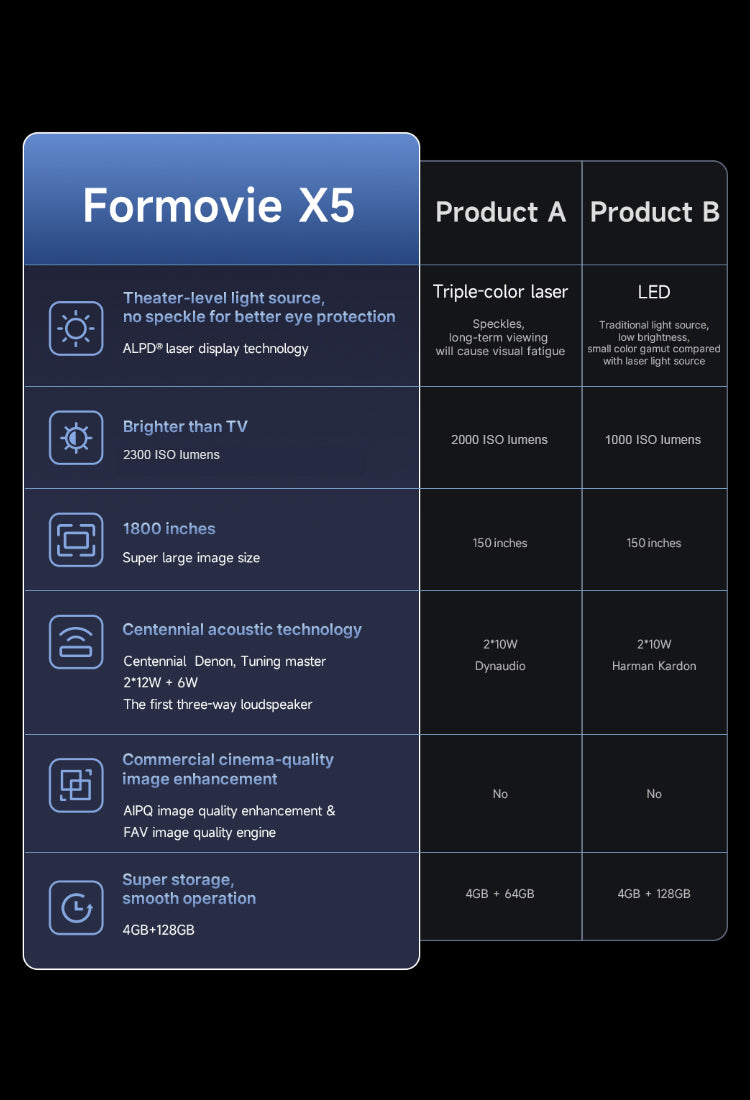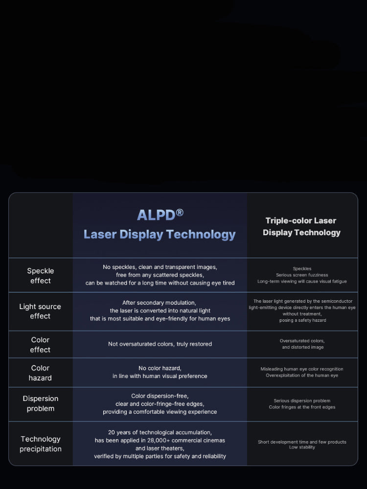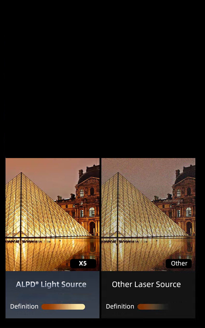 Compared to LED light source projectors, the Formovie X5 PRO Laser Projector offers sharper and clearer images. Thanks to ALPD technology, it achieves speckle-free projection, making it a more eye-friendly option compared to triple-color laser projectors
