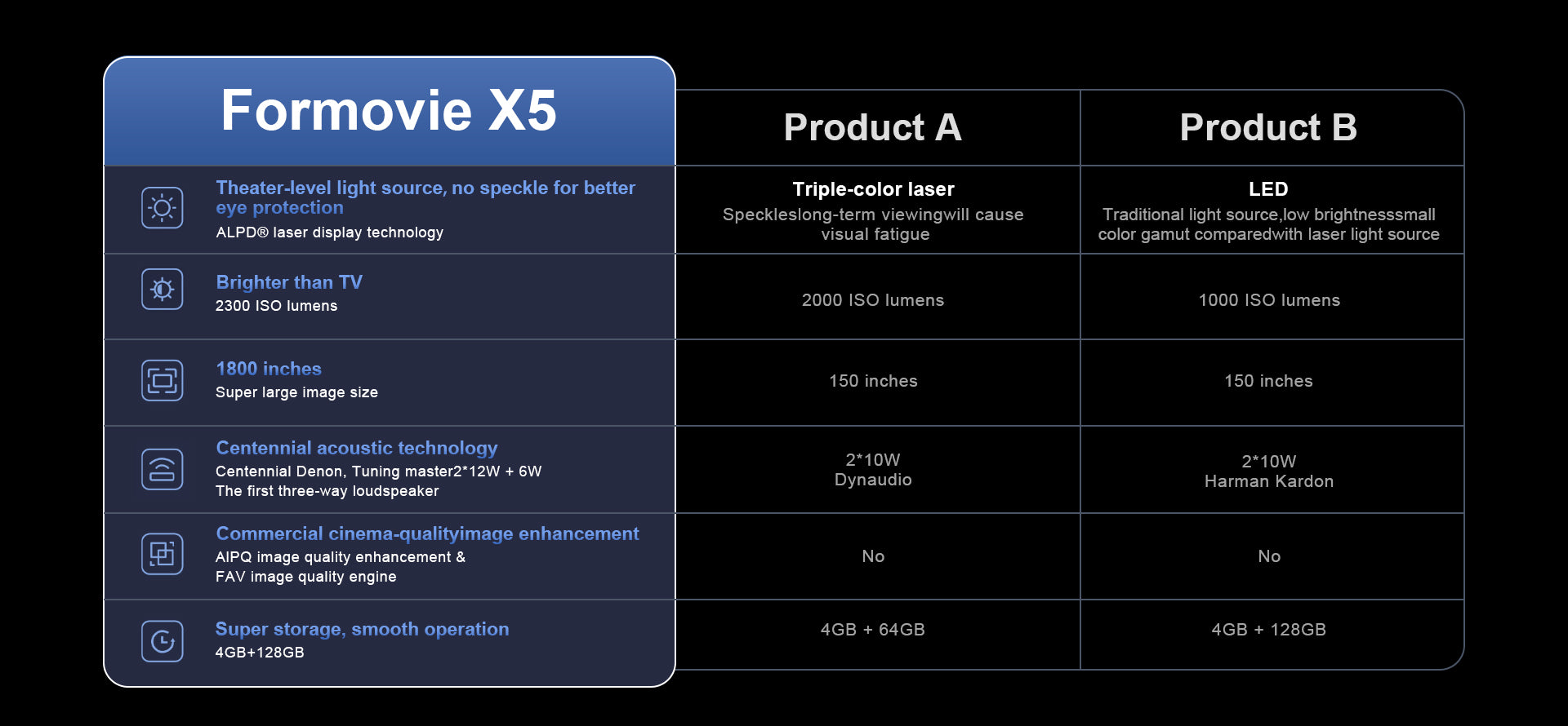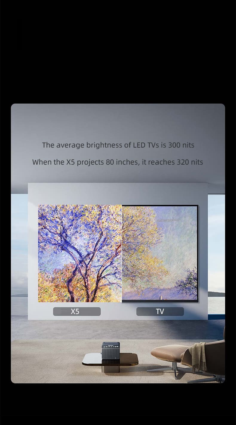 2266 CVIA Lumens(X5 PRO)/2300 ISO Lumens(X5). Brightness Surpasses Television