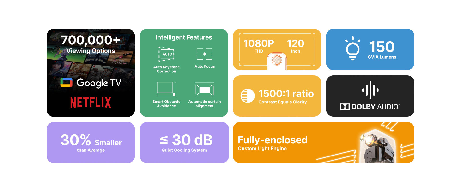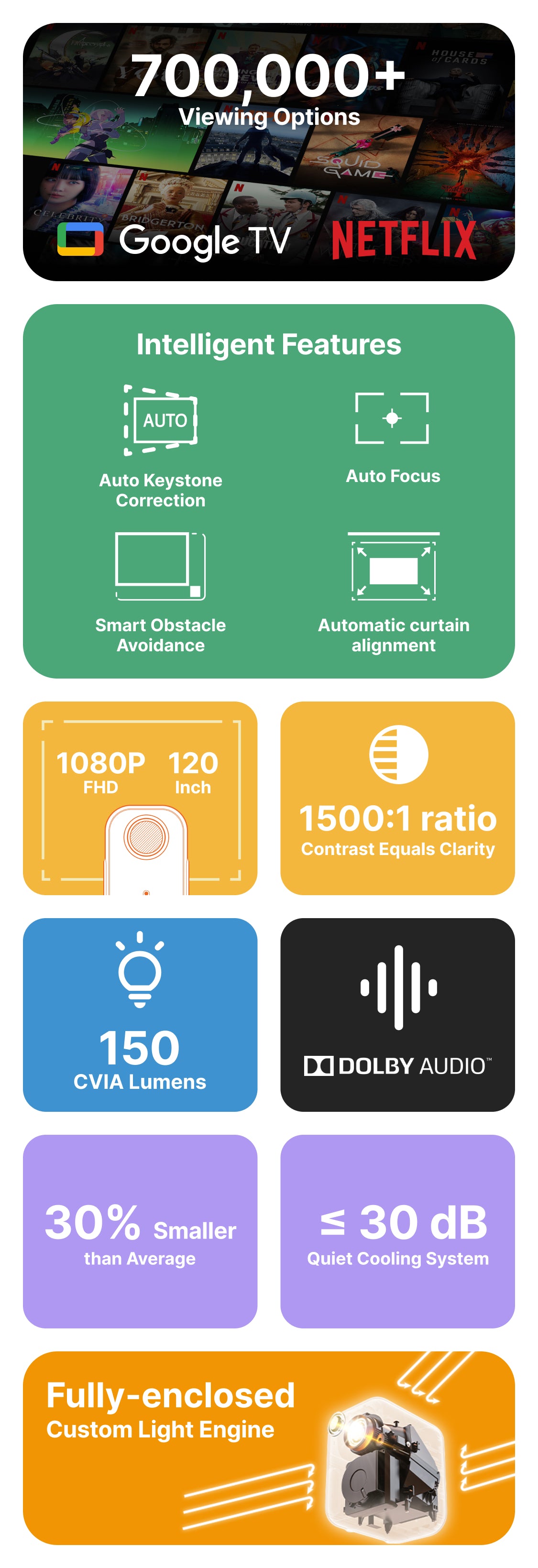 "This projector is unique for its Google TV and Native Netflix features, which make streaming easy and seamless without any additional devices."
