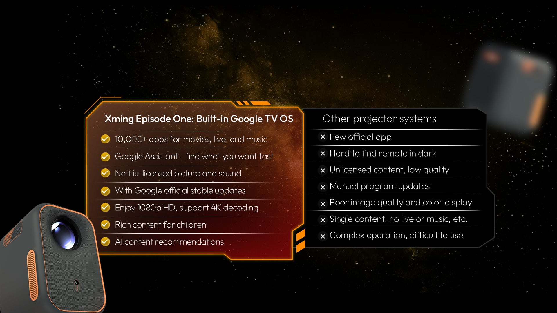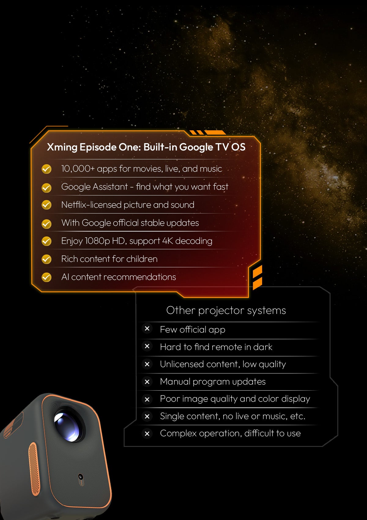 "This projector is unique for its Google TV and Native Netflix features, which make streaming easy and seamless without any additional devices."