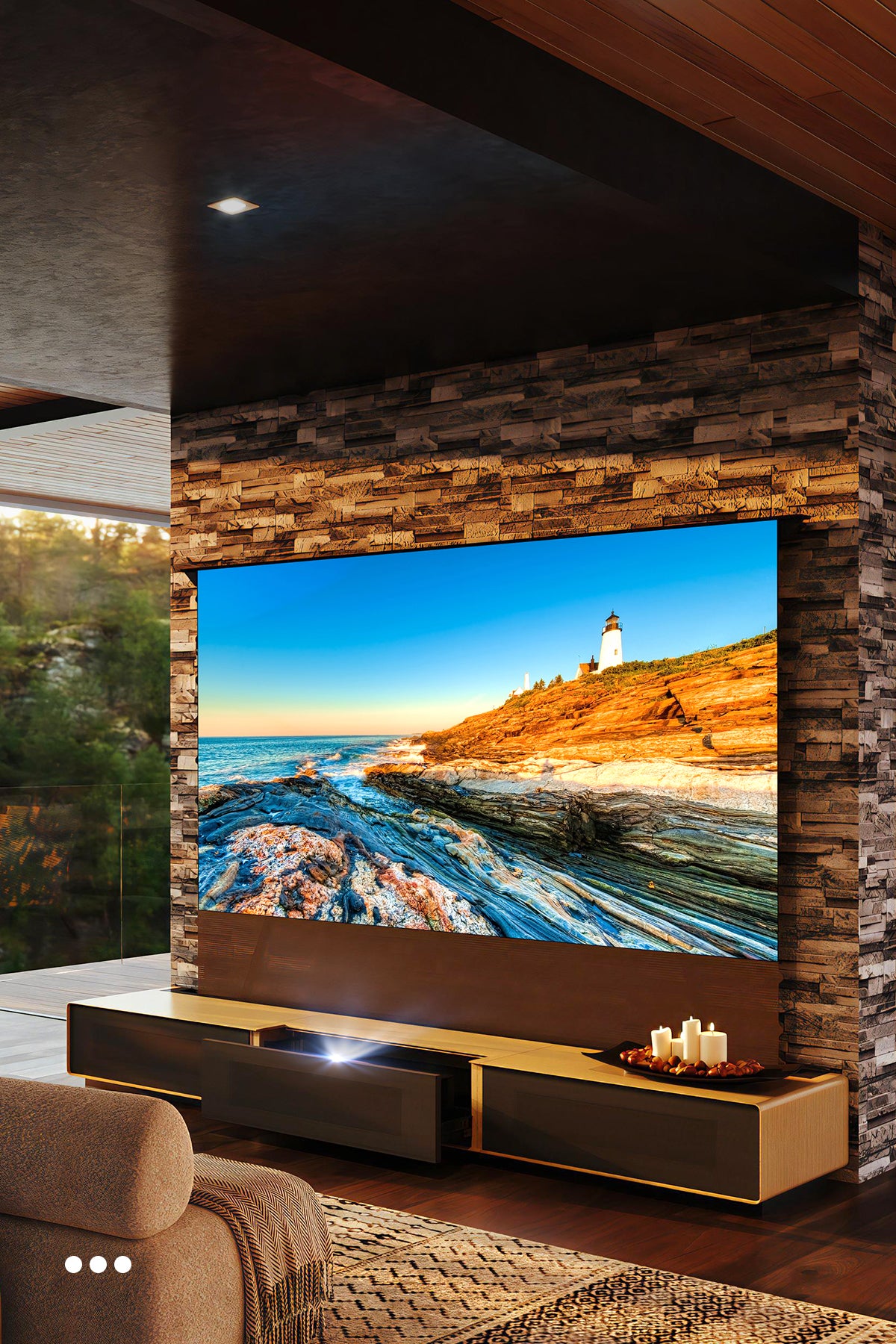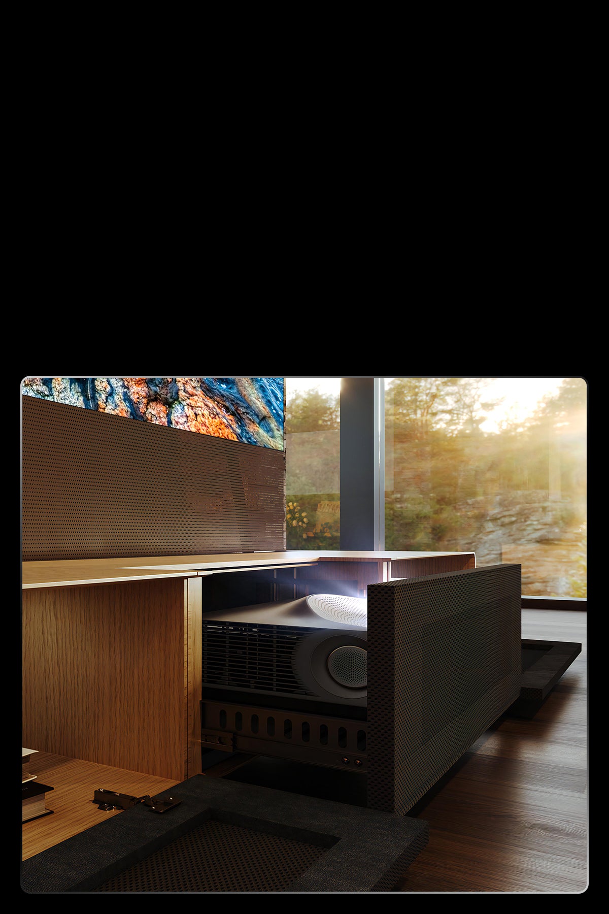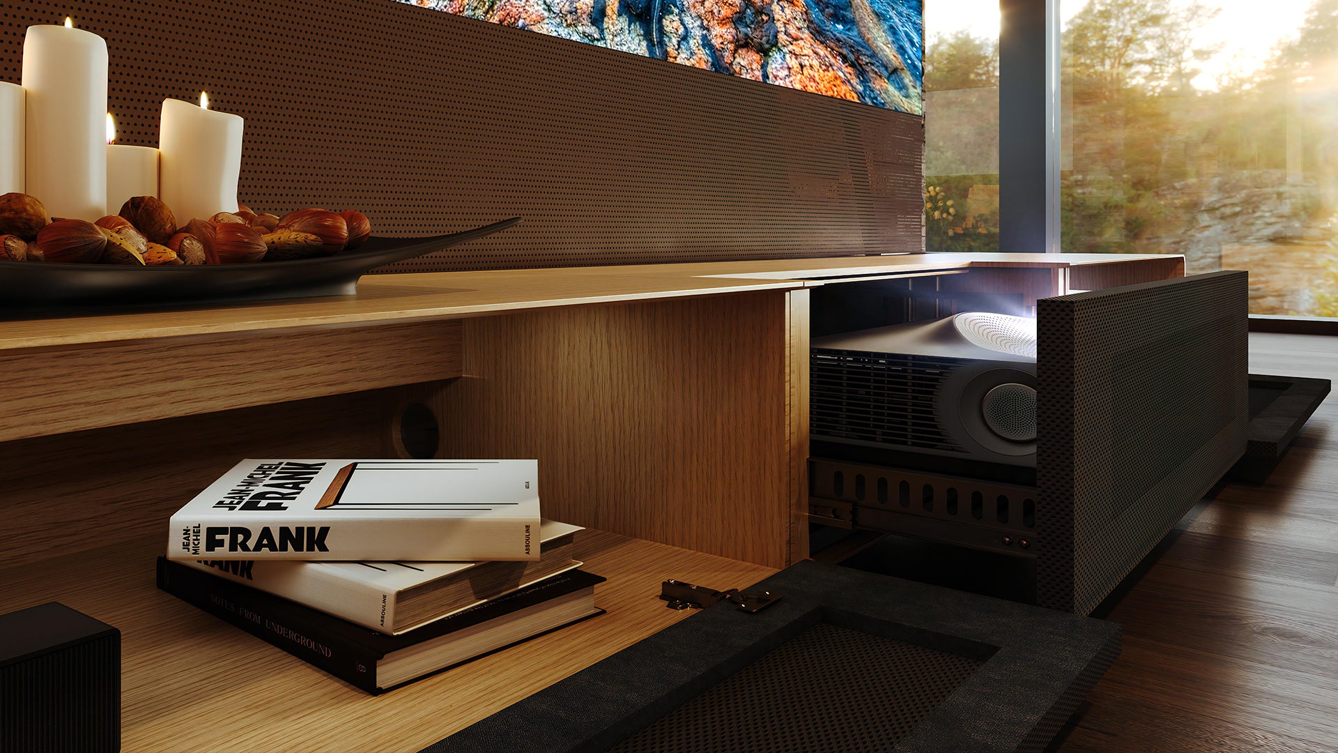 Redefine your viewing experience. The Shore Cabinet merges organic aesthetics with cutting-edge automation, offering the perfect housing for your Ultra Short Throw projector. Experience the magic of a hidden home theater: the synchronized motorization reveals your display when you need it and preserves your room's clean lines when you don’t.