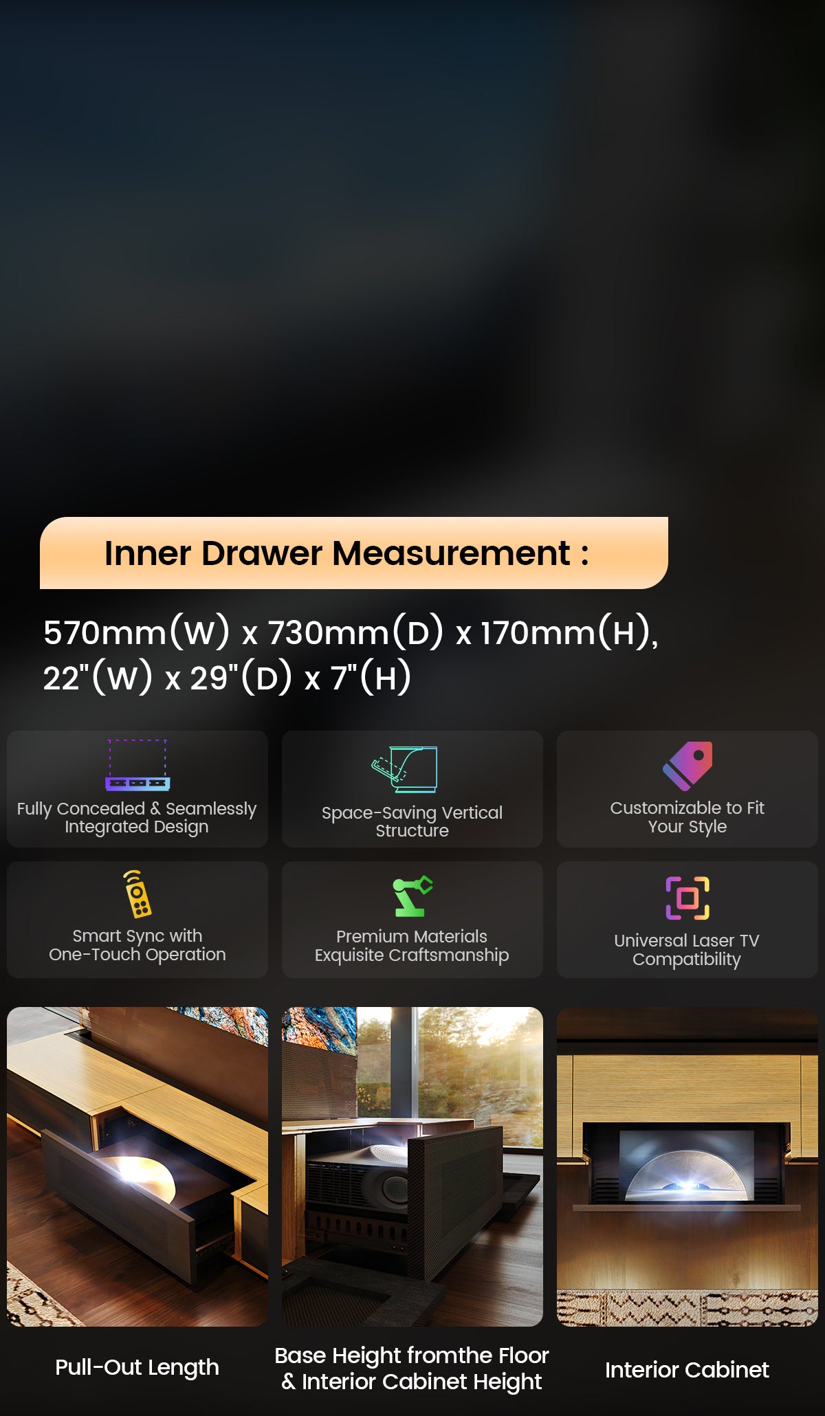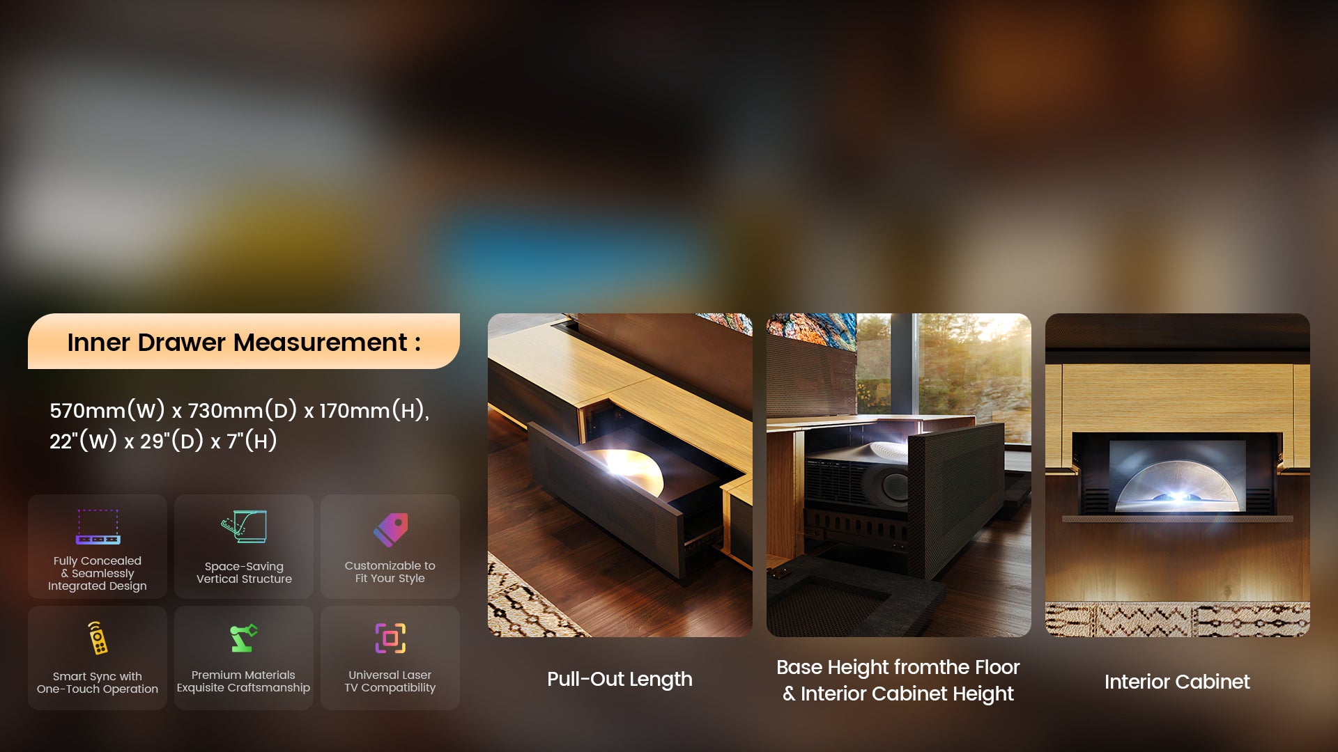 【Compatible with Most UST Projectors】The widened and elevated motorized drawer accommodates most UST projectors on the market with ease, like AWOL3000pro, Hisense PX3-PRO.