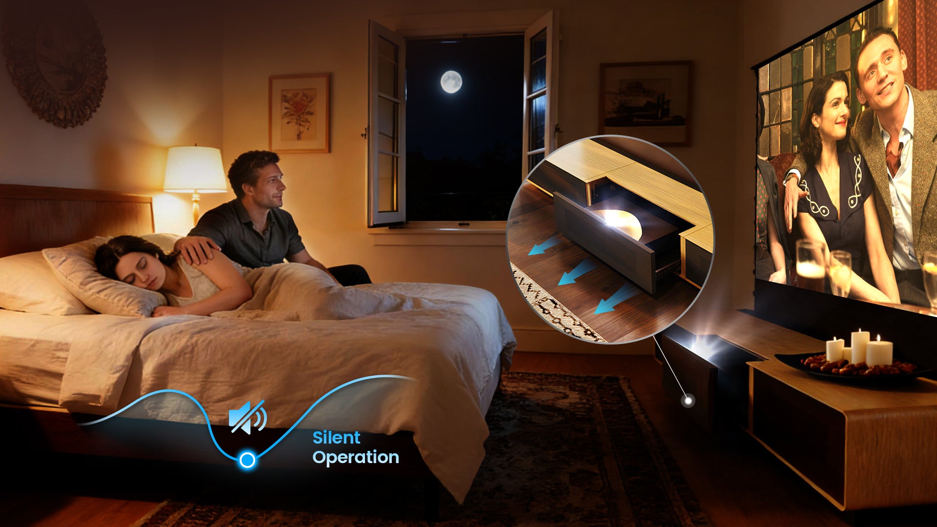 Experience truly silent operation. Set your projection distance once, and the system auto-adjusts to that exact spot every time you power on, ensuring your family sleeps undisturbed while you enjoy the show.