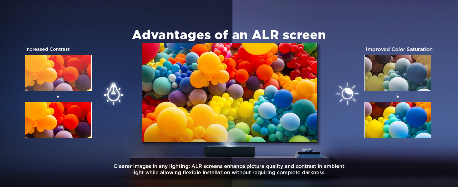 An ALR (Ambient Light Rejecting) screen is a type of screen that uses optical structures to reflect light coming from the direction of the projector while absorbing or deflecting ambient light