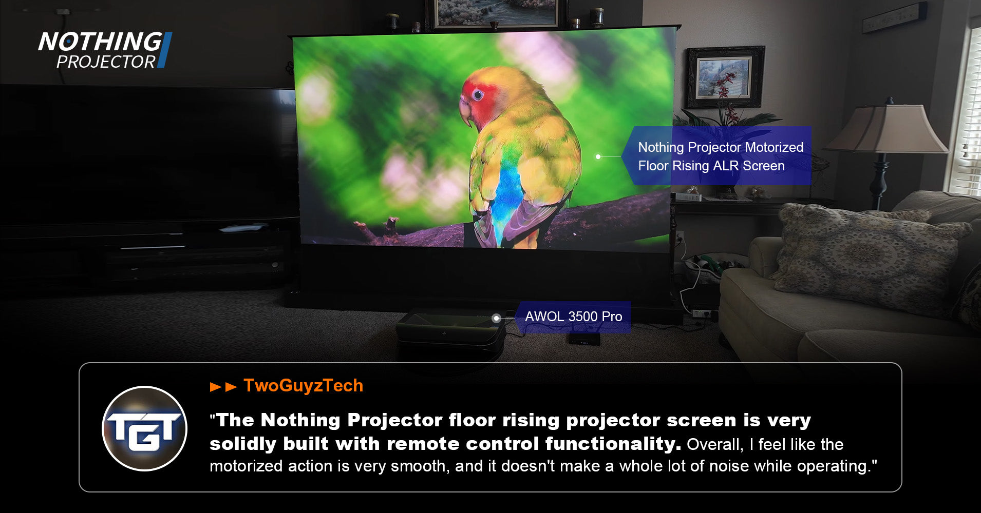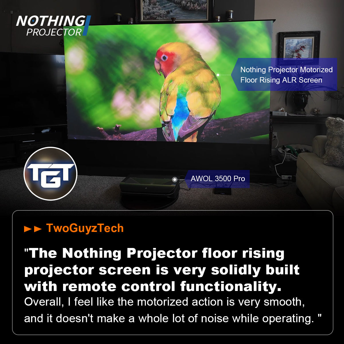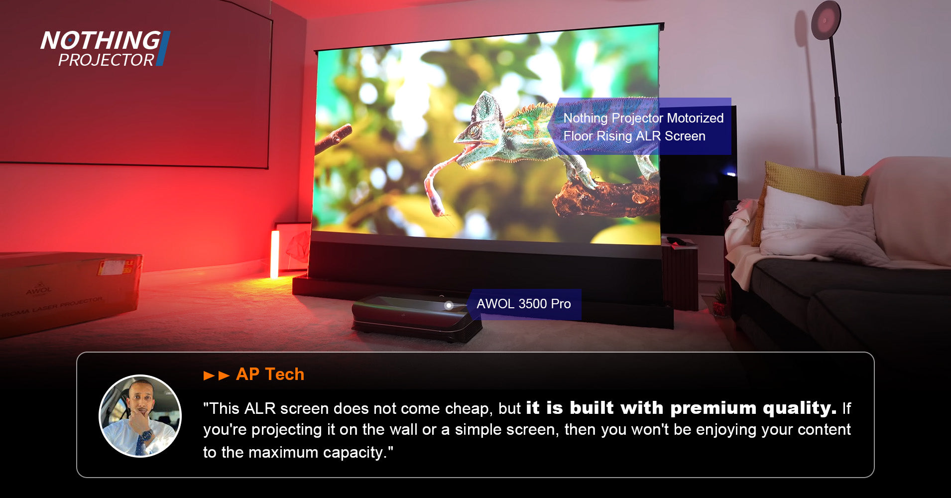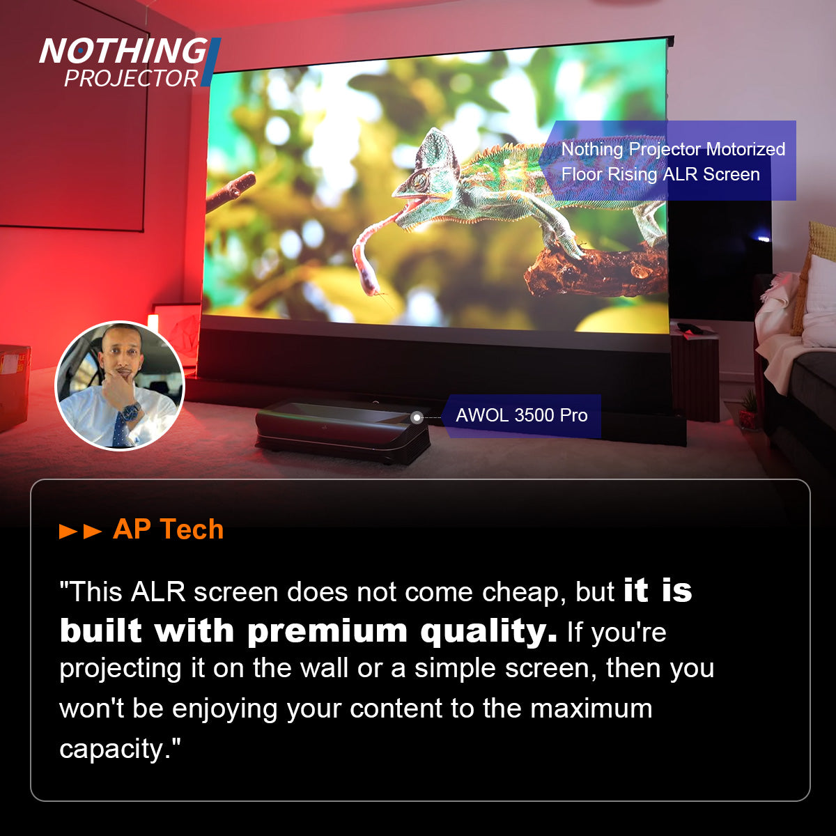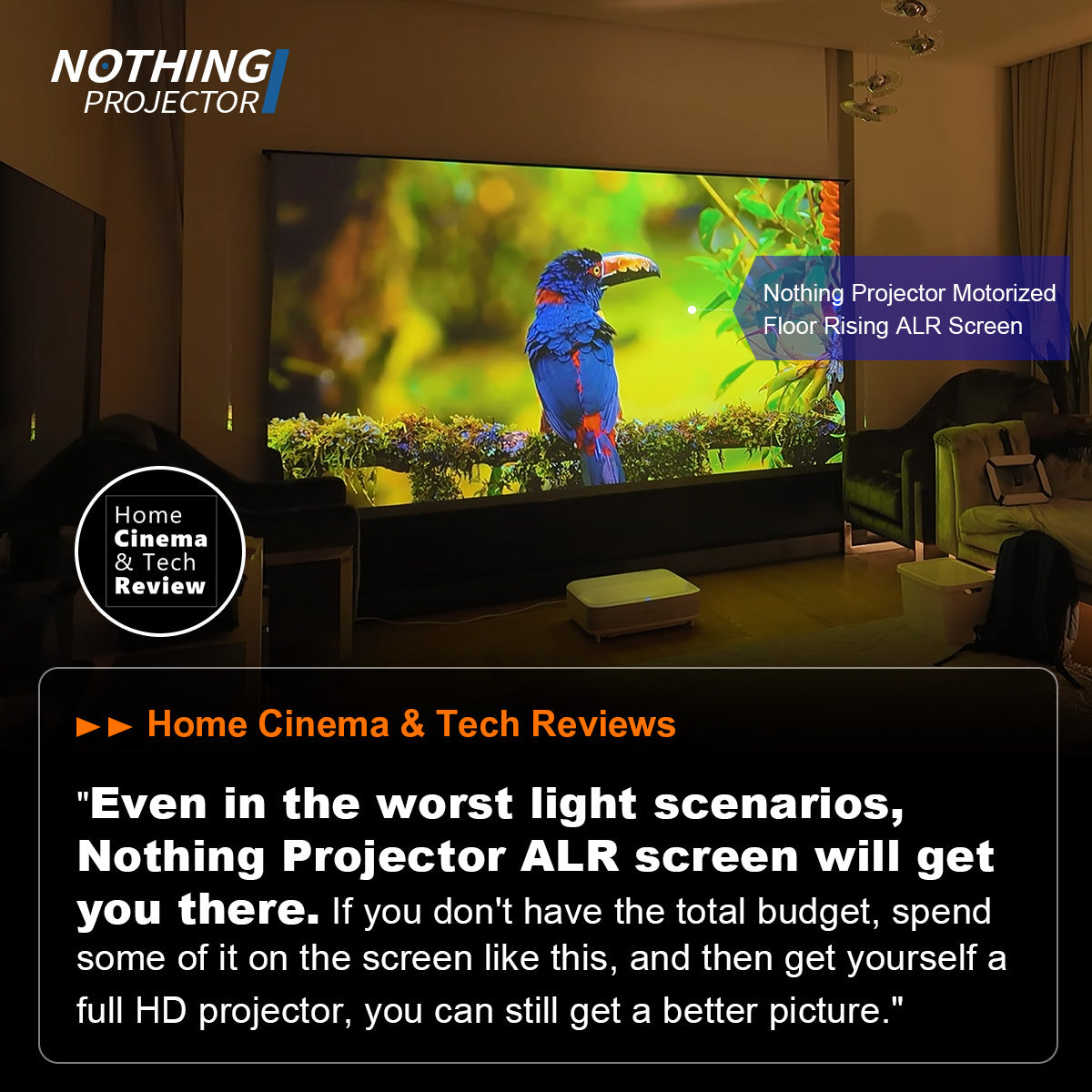 Le NothingProjector écran motorisé ALR de 120 pouces à montée au sol excelle à équilibrer performance et valeur, offrant un rejet robuste de la lumière ambiante, des noirs profonds et de larges angles de vision pour les salons lumineux. Son design motorisé, sa transparence acoustique et sa compatibilité avec la commande vocale simplifient l'intégration, tandis que l'écran à gain 0,6 minimise les reflets sans sacrifier la luminosité. Proposé à un prix compétitif, il offre une qualité de fabrication premium et une utilisation en journée, lui valant le titre de "Top Choice" 2025.