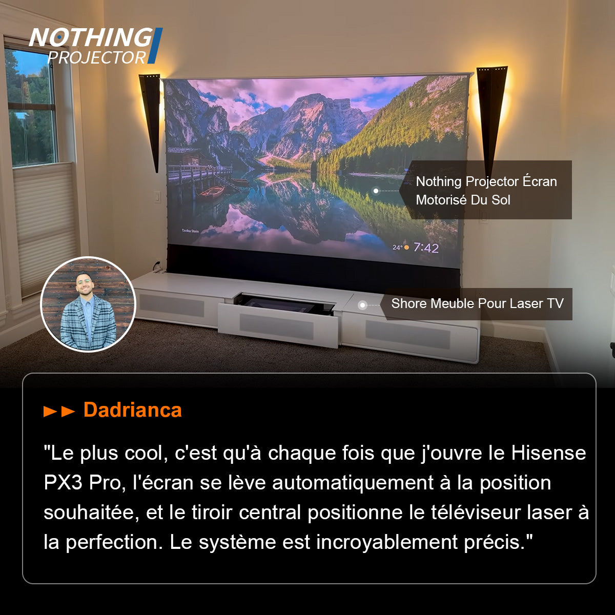 L'écran motorisé Nothing Projector Black Series se distingue comme une solution home cinéma innovante et esthétique, capable de transformer instantanément n’importe quel espace en salle de projection. Il allie excellence technique et design discret, avec une qualité d’image rivalisant avec des écrans fixes bien plus chers.