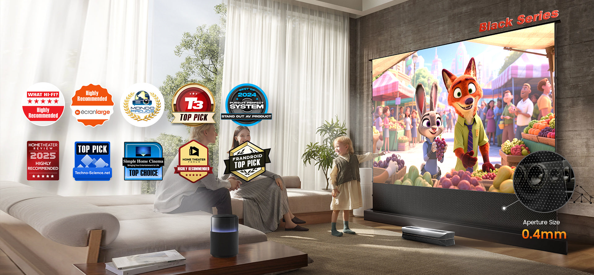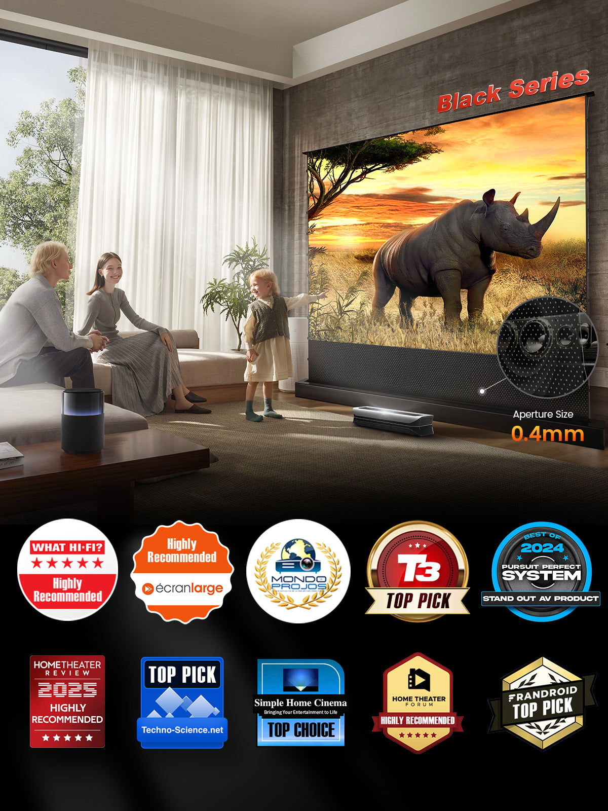 - Rejet de la lumière ambiante : Équipé de la technologie ALR avancée, il offre une qualité d'image supérieure en rejetant la lumière ambiante, idéal pour les environnements lumineux. Cela en fait un excellent choix pour les systèmes de home cinéma intelligents et autres conceptions de home cinéma.