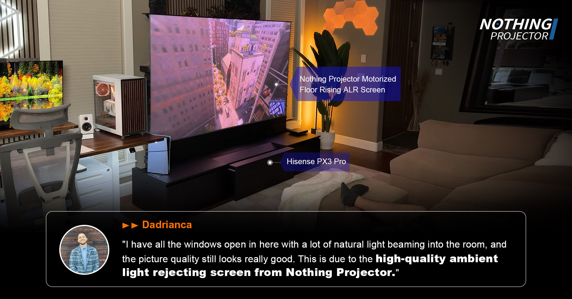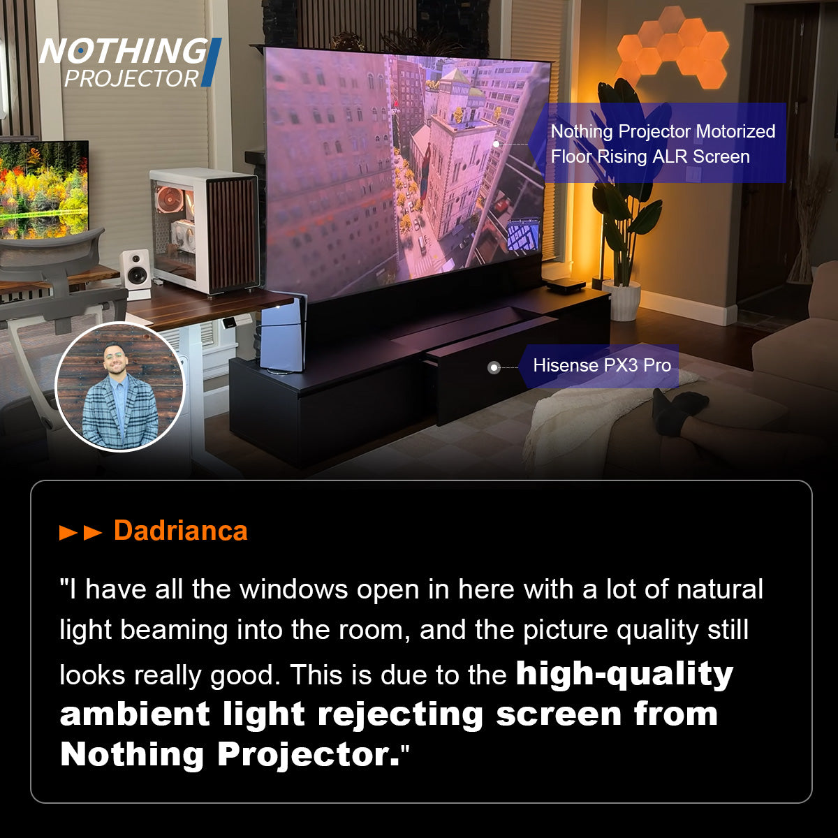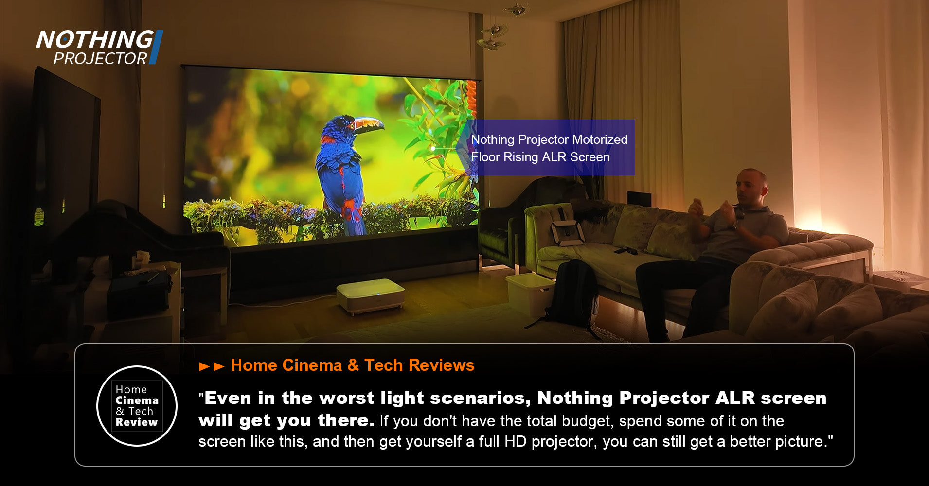 D'après l'avis, l'écran sur pied NothingProjector Black Series offre des performances excellentes dans les pièces sombres, que ce soit avec ou sans éclairage au plafond, proposant un contraste élevé et une apparence noir convaincante. Il reste remarquablement plat et agréable à regarder même dans des conditions d'éclairage ambiant difficiles, à condition de contrôler légèrement la lumière, par exemple en fermant les stores. Bien qu'aucune technologie d'écran ne soit parfaite dans des espaces entièrement éclairés, ce modèle constitue une solution équilibrée et fiable dans la vie réelle pour la plupart des propriétaires de UST.