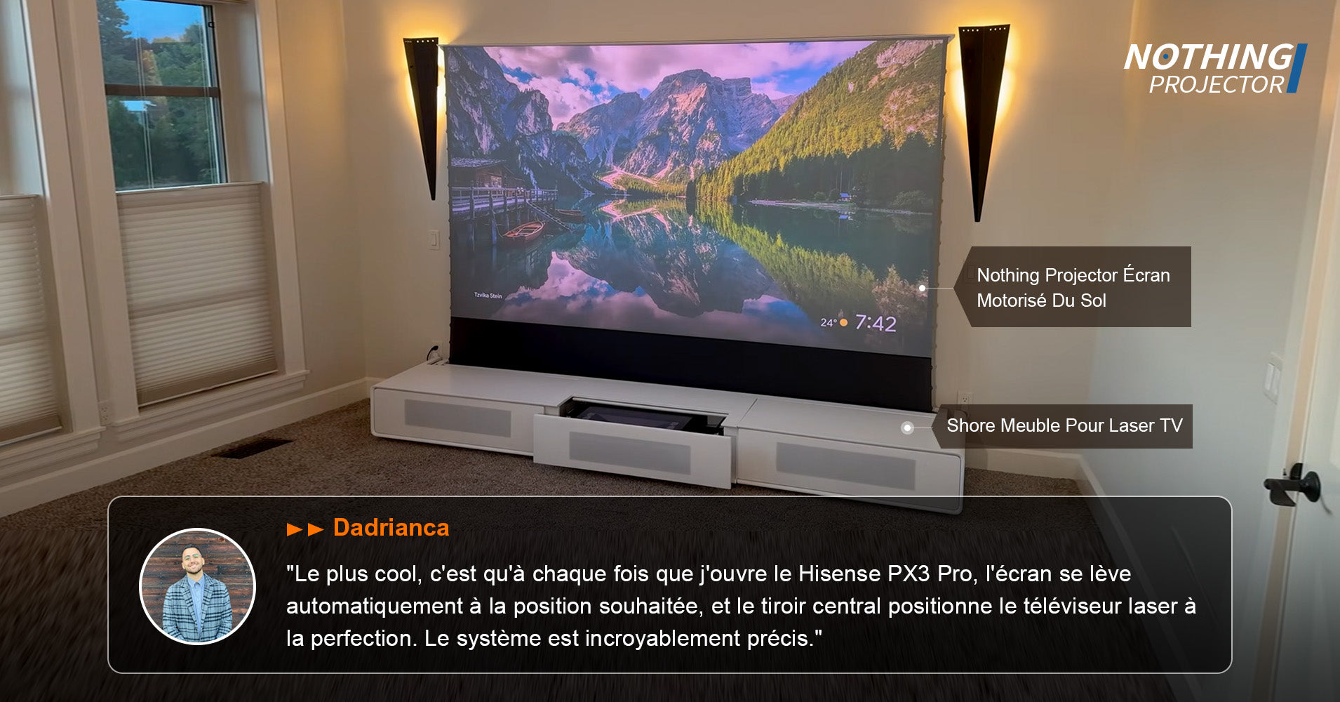 Acquisition de l’écran Nothing Black UST ALR motorisé au sol de 120″ ; la configuration est simple. La surface Carbon Black à gain de 0,6 approfondit les noirs, préserve les reflets et maintient l'uniformité sur une visualisation d'environ 170°. Utilisable avec la lumière ambiante, sans arc-en-ciel ni éclat laser. La section inférieure perforée supporte les haut-parleurs. Surface tendue par languette. Se range proprement, semble robuste. Mérite un "fortement recommandé".