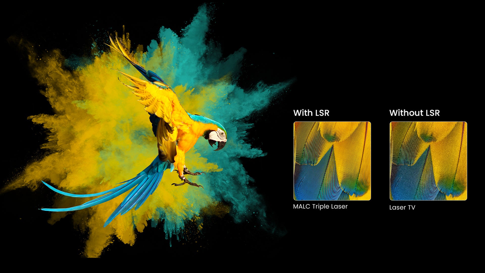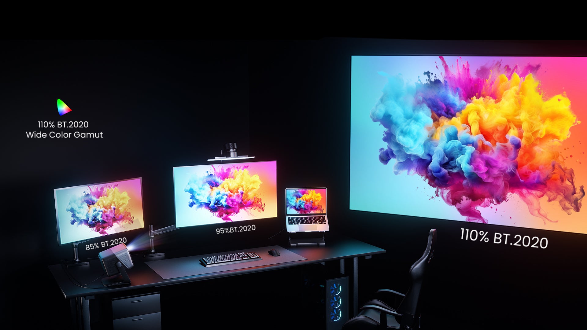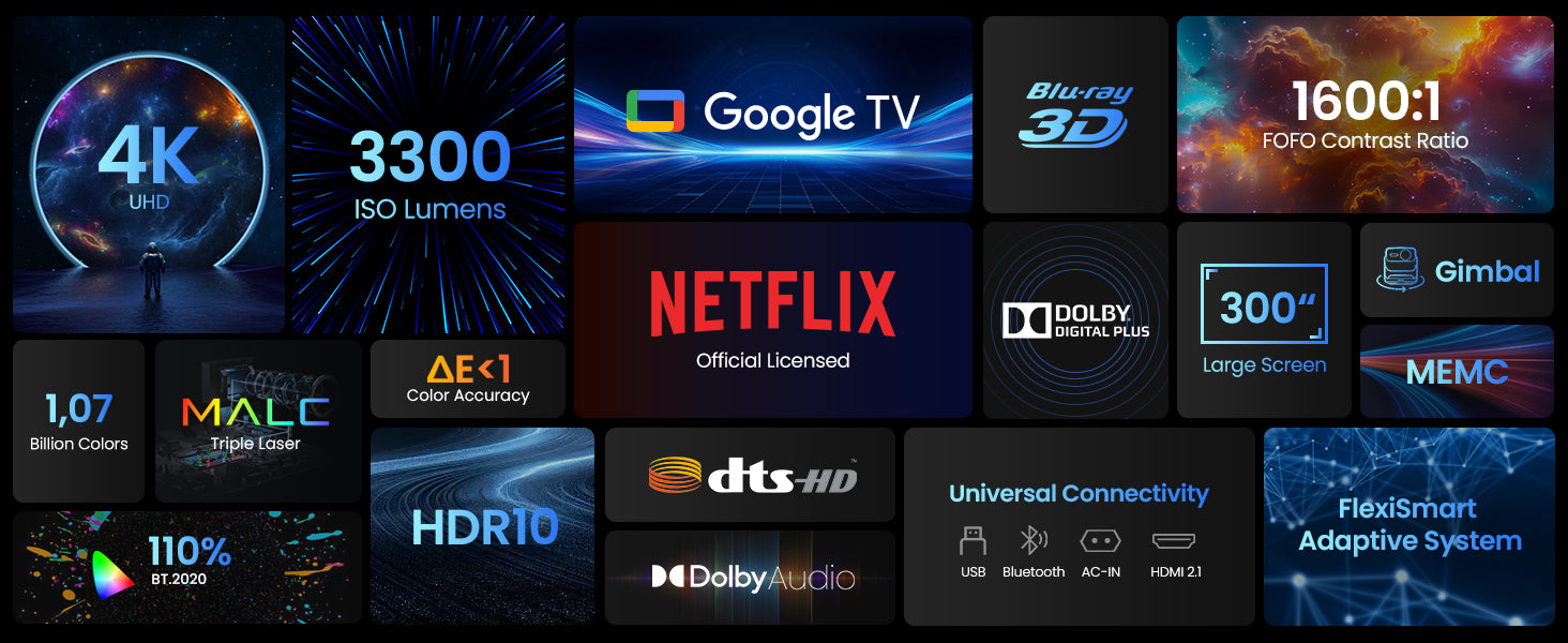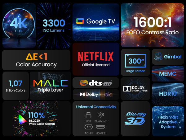 JMGO skjávarpinn er með háþróaðri MALC™ 2.0 þrefaldri lita leysigeisla sem dregur úr augnálagi með mýkra, náttúrulegra ljósi. Hann lágmarkar útsetningu fyrir bláu ljósi og tryggir líflega liti og skarpar myndir, sem gerir hann tilvalinn fyrir fjölskyldur og fagfólk sem...