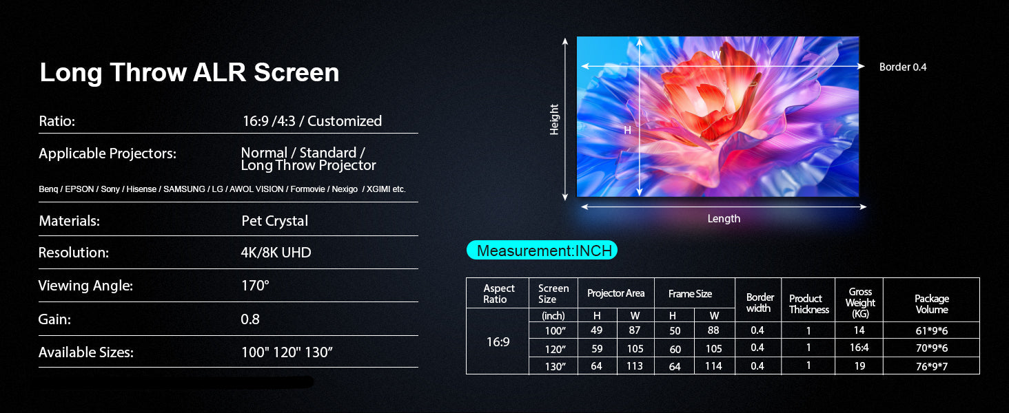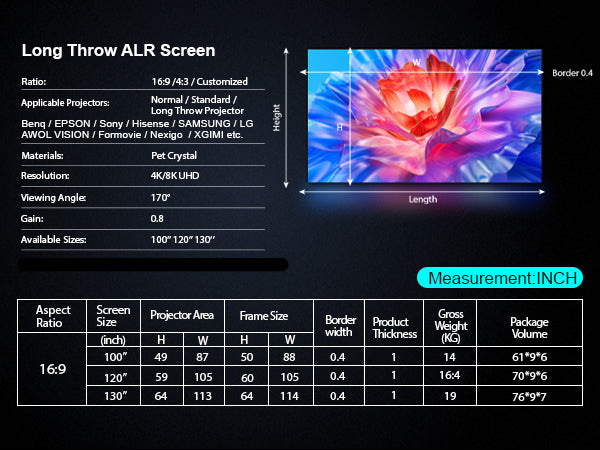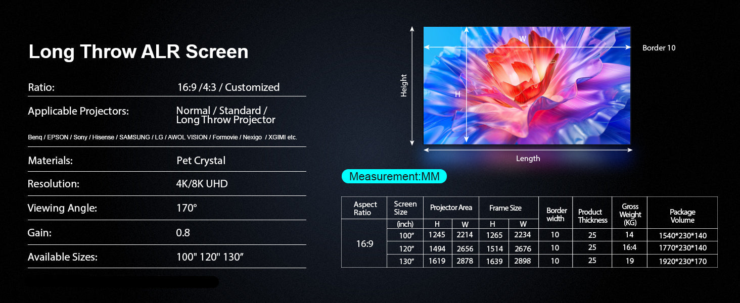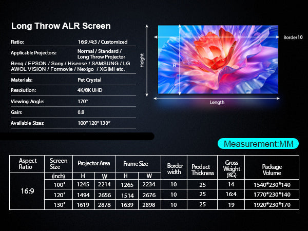 - Matériau d'écran ALR longue focale amélioré : performances supérieures pour les projecteurs longue focale.