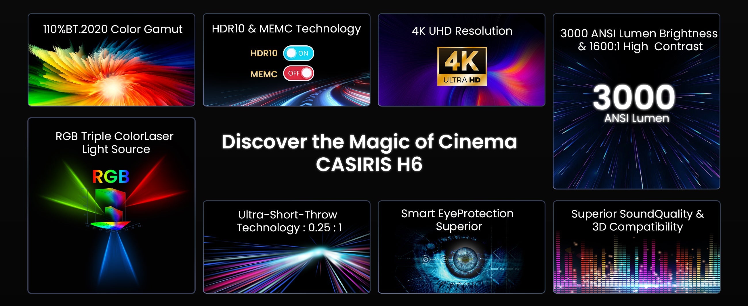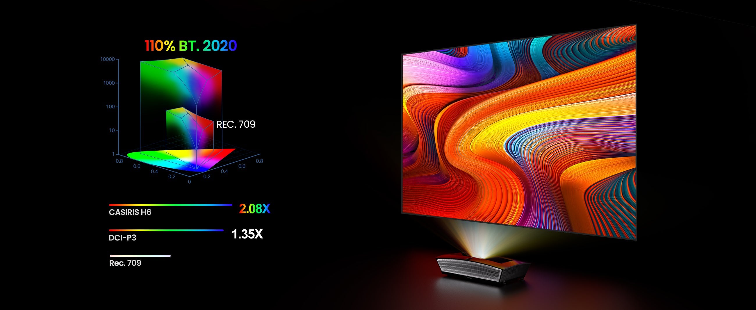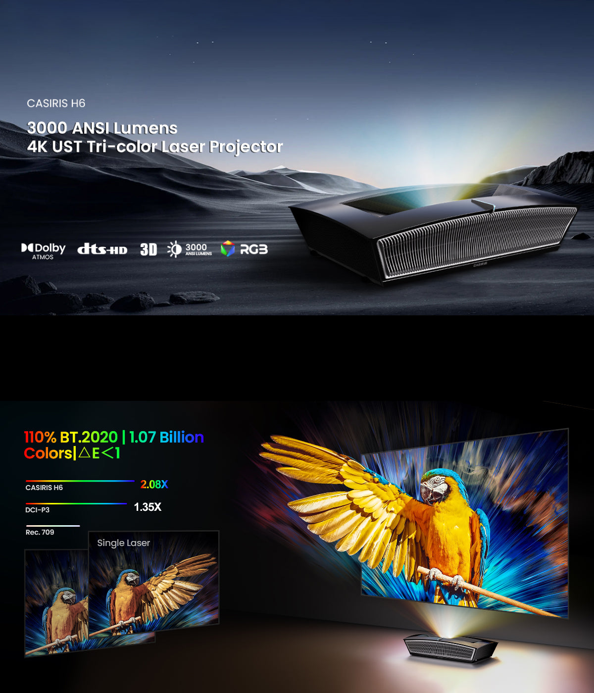 - 【Trippel laserteknologi】CASIRIS H6 kan skilte med en avansert RGB trippel laserlyskilde, noe som skiller den fra konvensjonelle projektorer som utelukkende er avhengige av en blå lyskilde. Denne banebrytende designen eliminerer behovet for et fargehjul og sikrer upåklagelig fargepresisjon. Si farvel til fargehjulartefakter og fordyp deg i bilder presentert i sin autentiske og uforfalskede form.