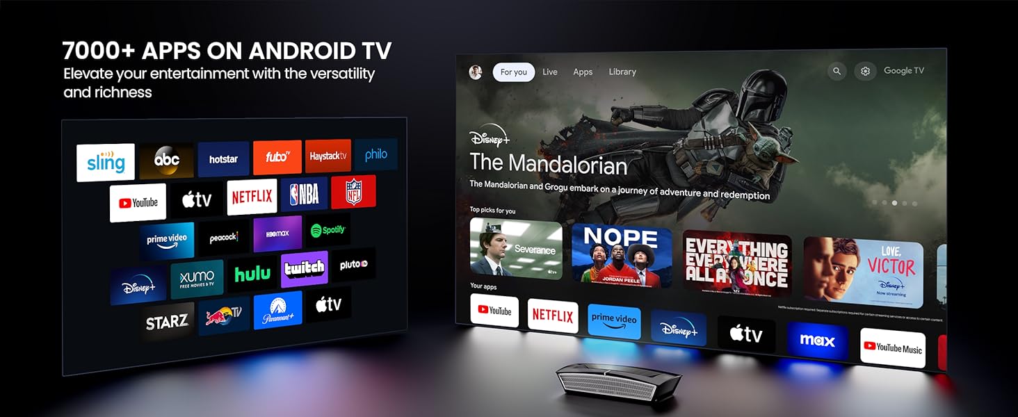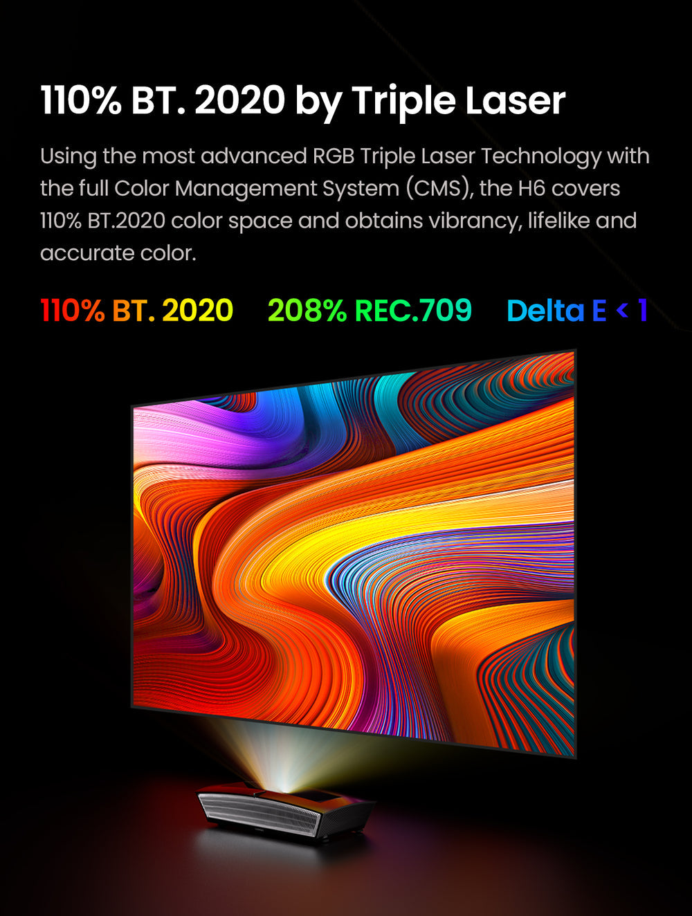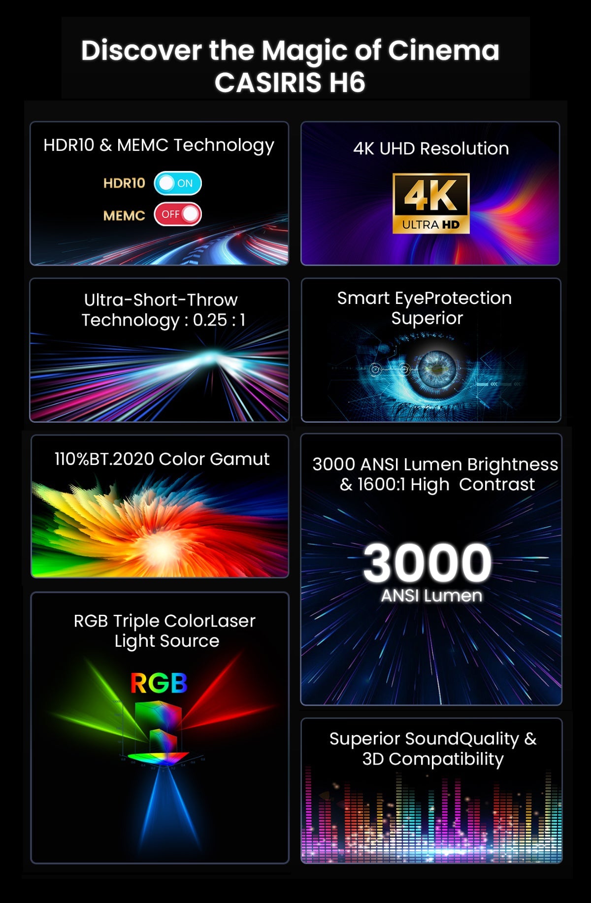 - 【Trippel laserteknologi】CASIRIS H6 kan skilte med en avansert RGB trippel laserlyskilde, noe som skiller den fra konvensjonelle projektorer som utelukkende er avhengige av en blå lyskilde. Denne banebrytende designen eliminerer behovet for et fargehjul og sikrer upåklagelig fargepresisjon. Si farvel til fargehjulartefakter og fordyp deg i bilder presentert i sin autentiske og uforfalskede form.