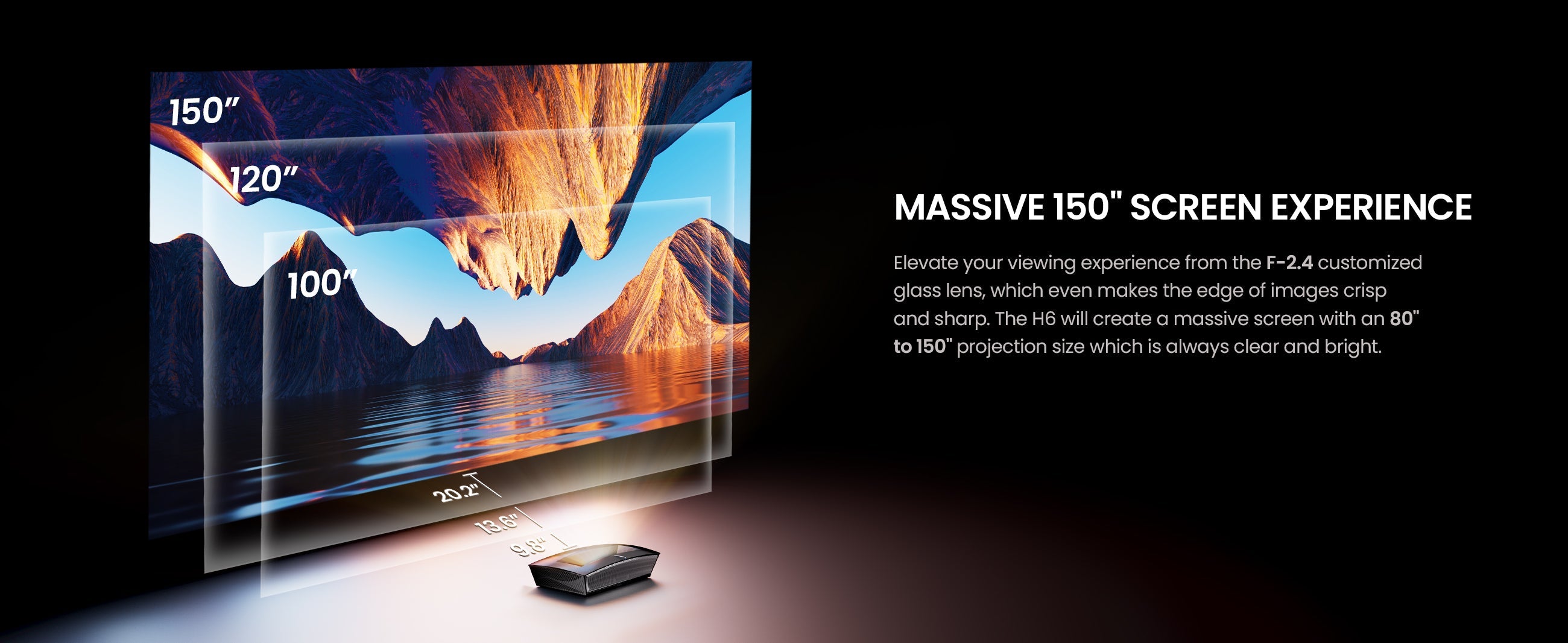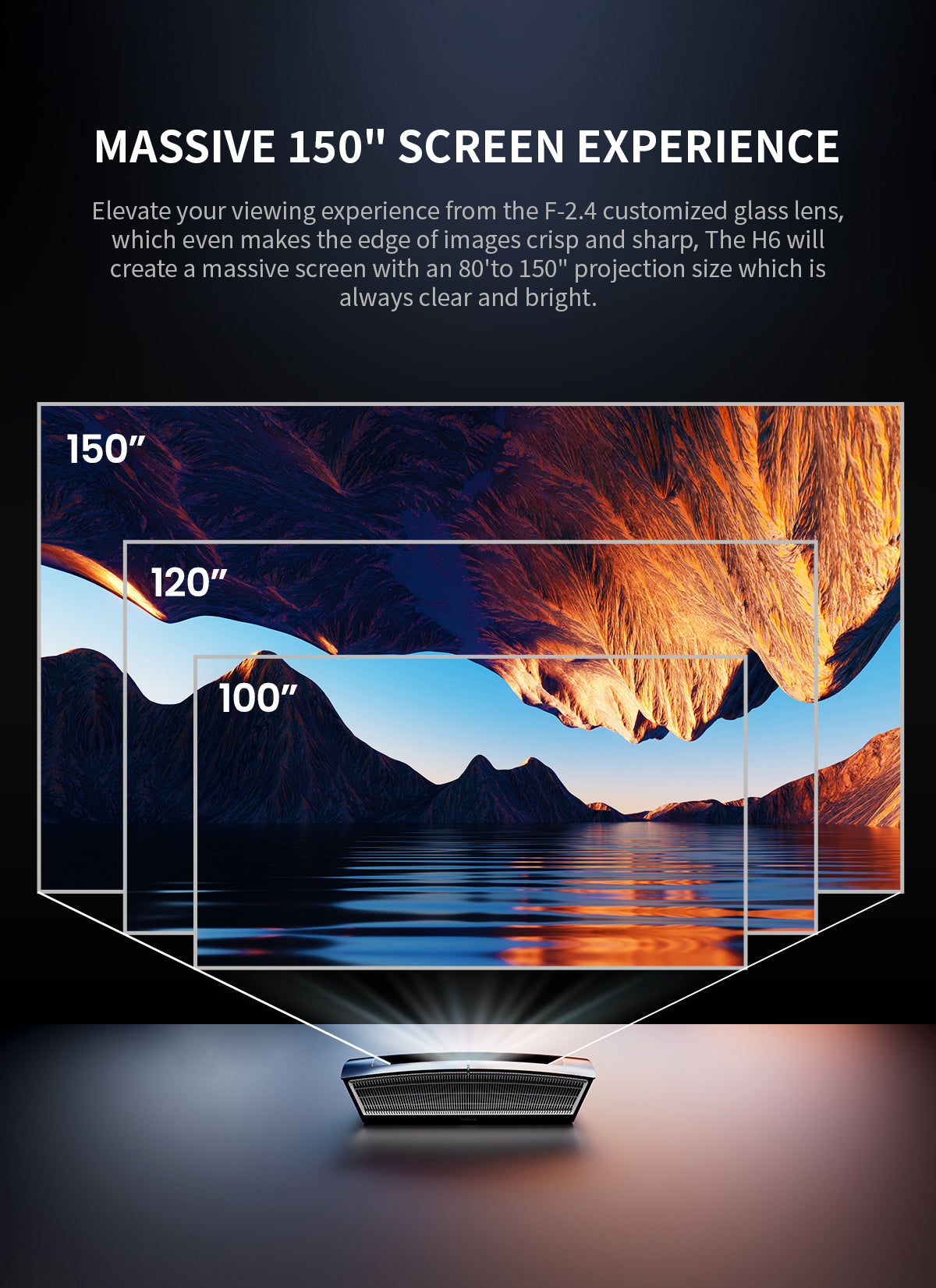 - 【Kino storskjerm】CASIRIS H6, med et projeksjonsforhold på 0,25:1, kan oppnå en maksimal skjermstørrelse på 150 tommer, noe som gir deg en kinoaktig seeropplevelse.