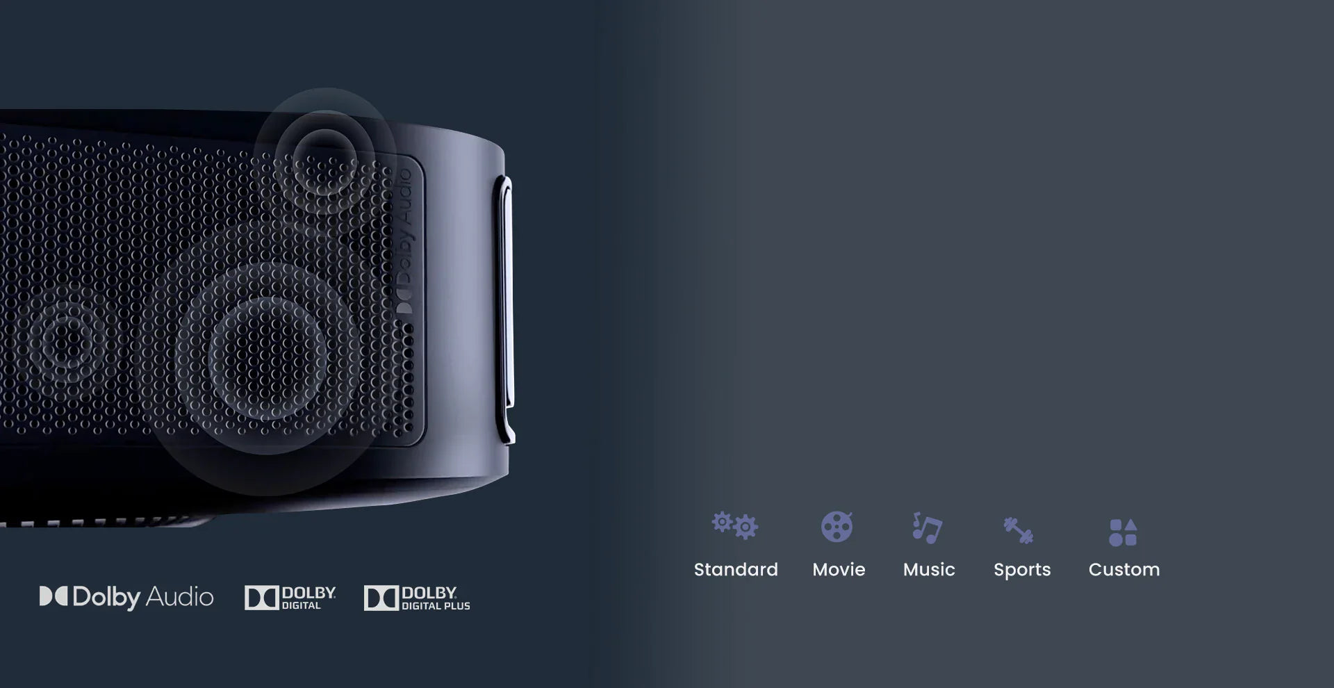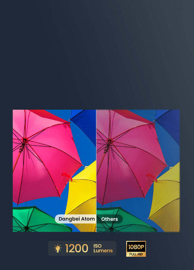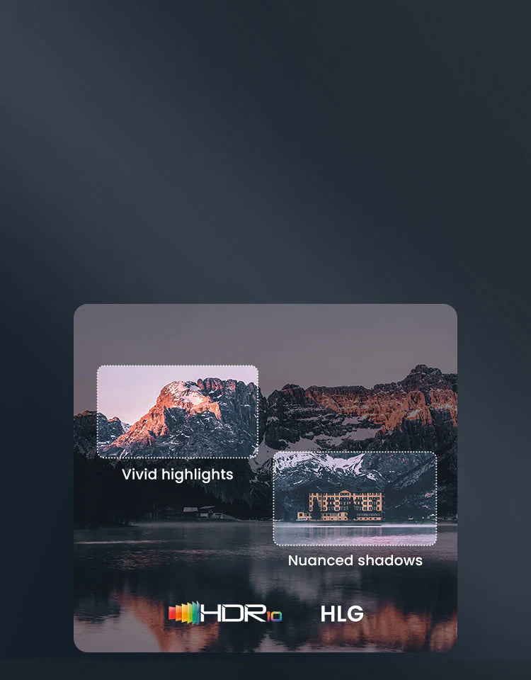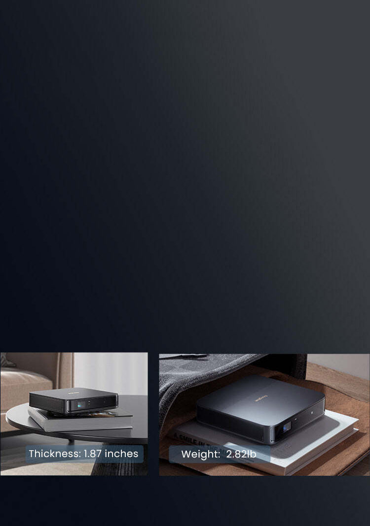 - Ta med teateret hjem: Fordyp deg i et fantastisk 1080p-bilde på opptil 180 tommer, støttet av HDR10. Opplev lyd i kinokvalitet, levert gjennom to innebygde 5 W-høyttalere med Dolby Audio.