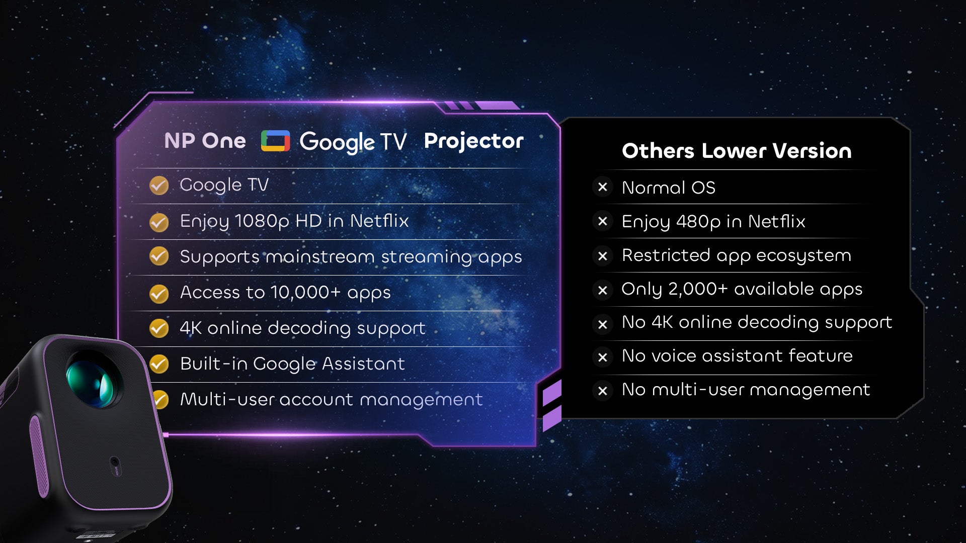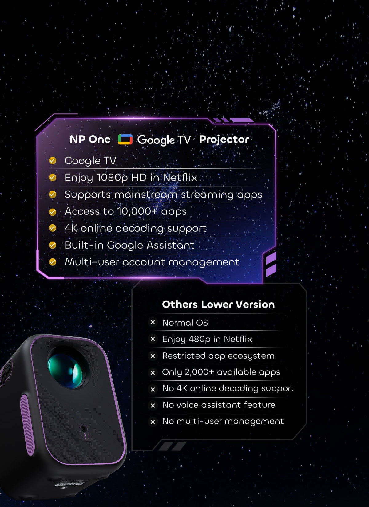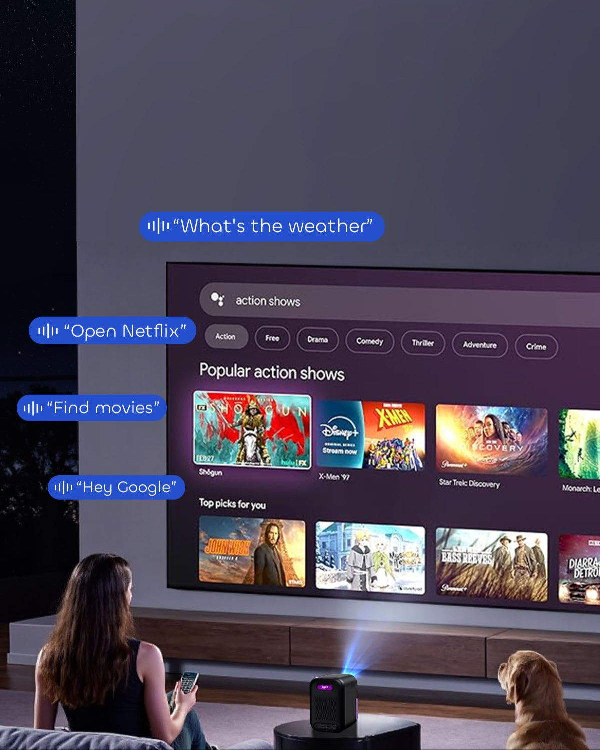 【Google TV Smart Projektor】NothingProjector One Smart er din alt-i-ett smartprojektor, drevet av Google TV med innebygd Netflix-støtte. Strøm over 10 000 apper direkte – uten dongler, uten forsinkelser. Fra filmer og spill til YouTube-kaninhull, alt er bare et trykk unna.