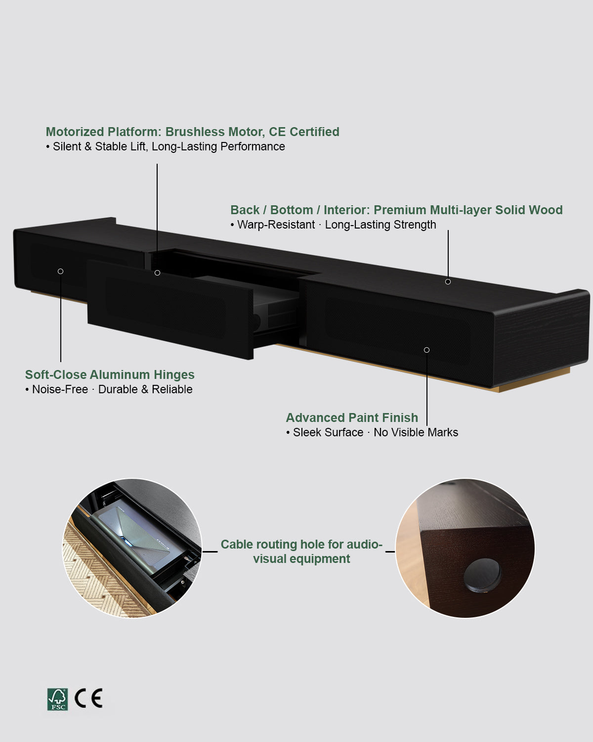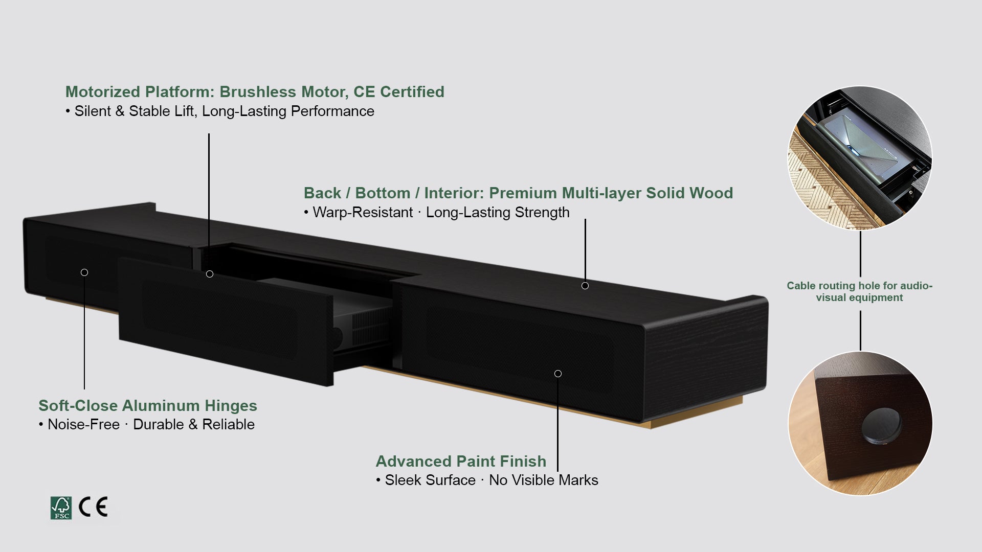 The Shore Motorized Screen and Cabinet brings a premium, furniture-grade solution to UST projector setups. With solid steel construction, a smooth motorized mechanism, and smart design touches like cooling and cable management, it blends style with practicality.
