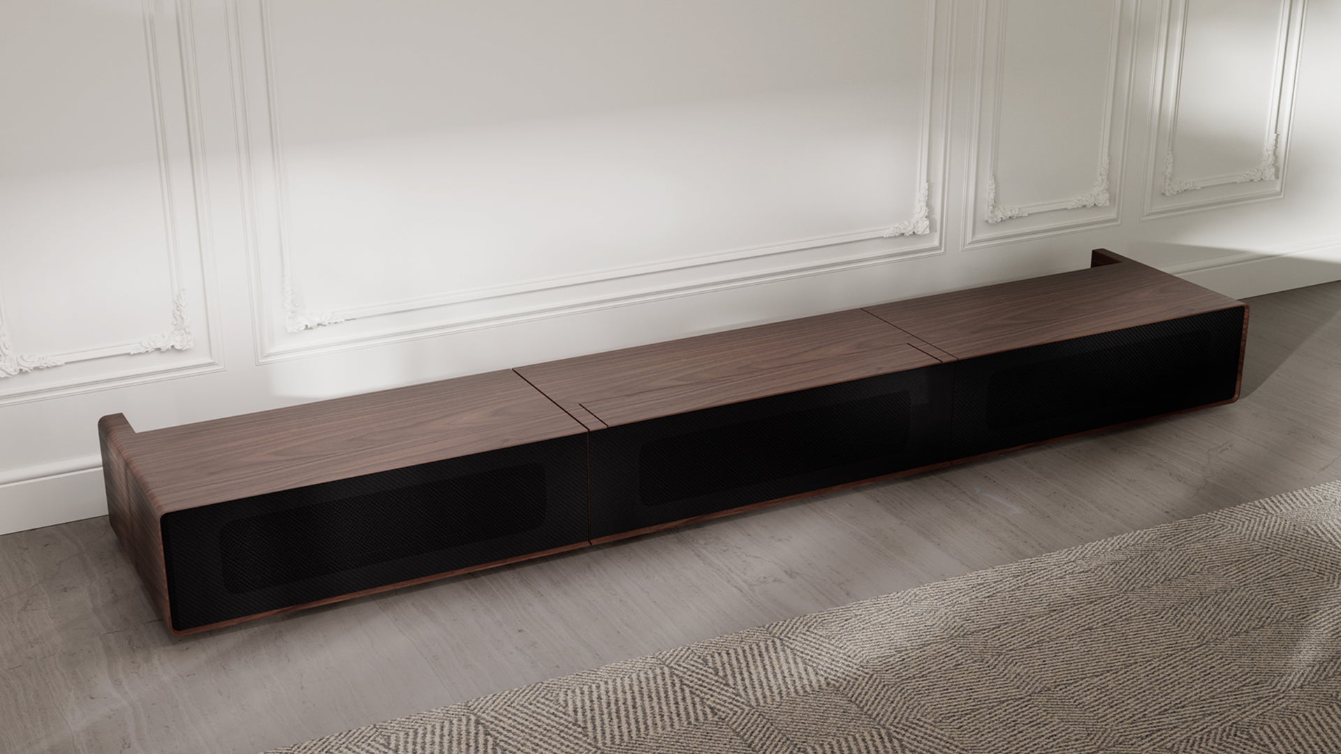 - Doble skjulte skuffer i aluminiumsramme for integrering av AV-utstyr
