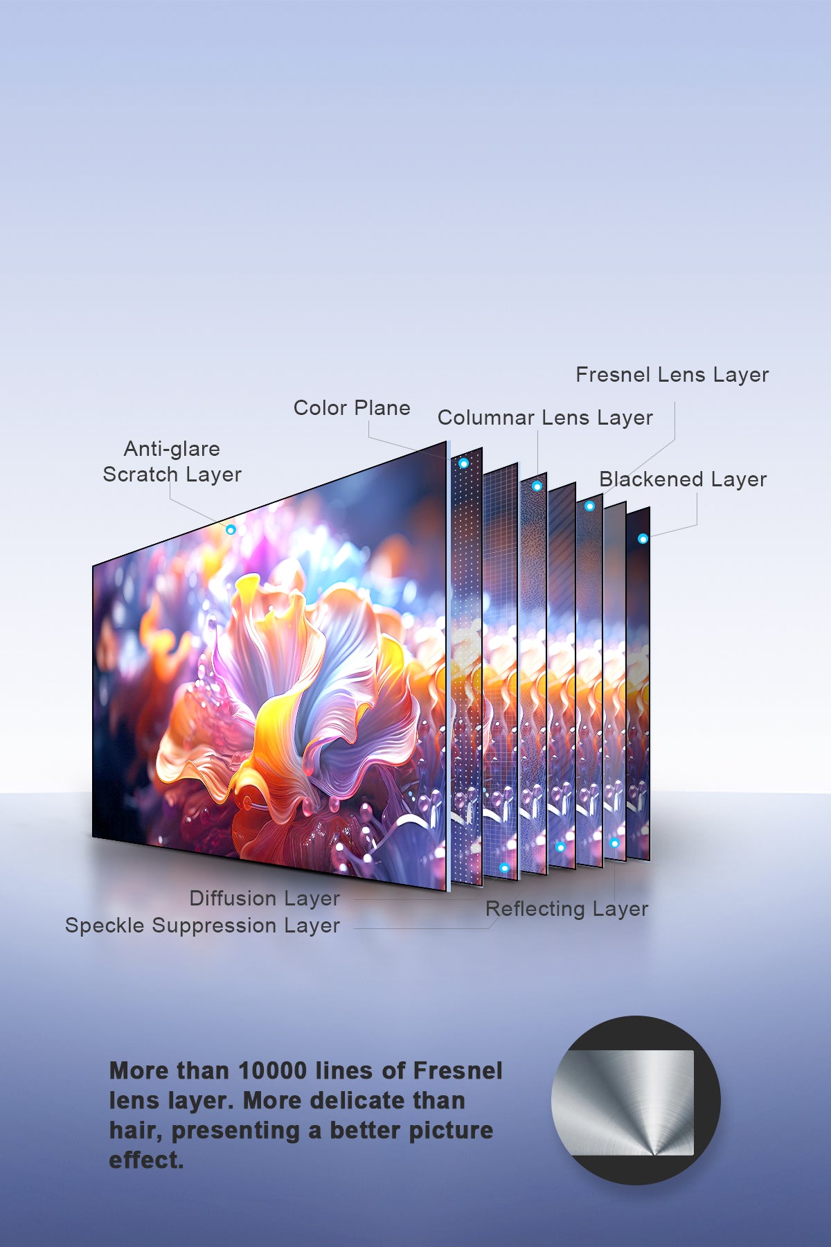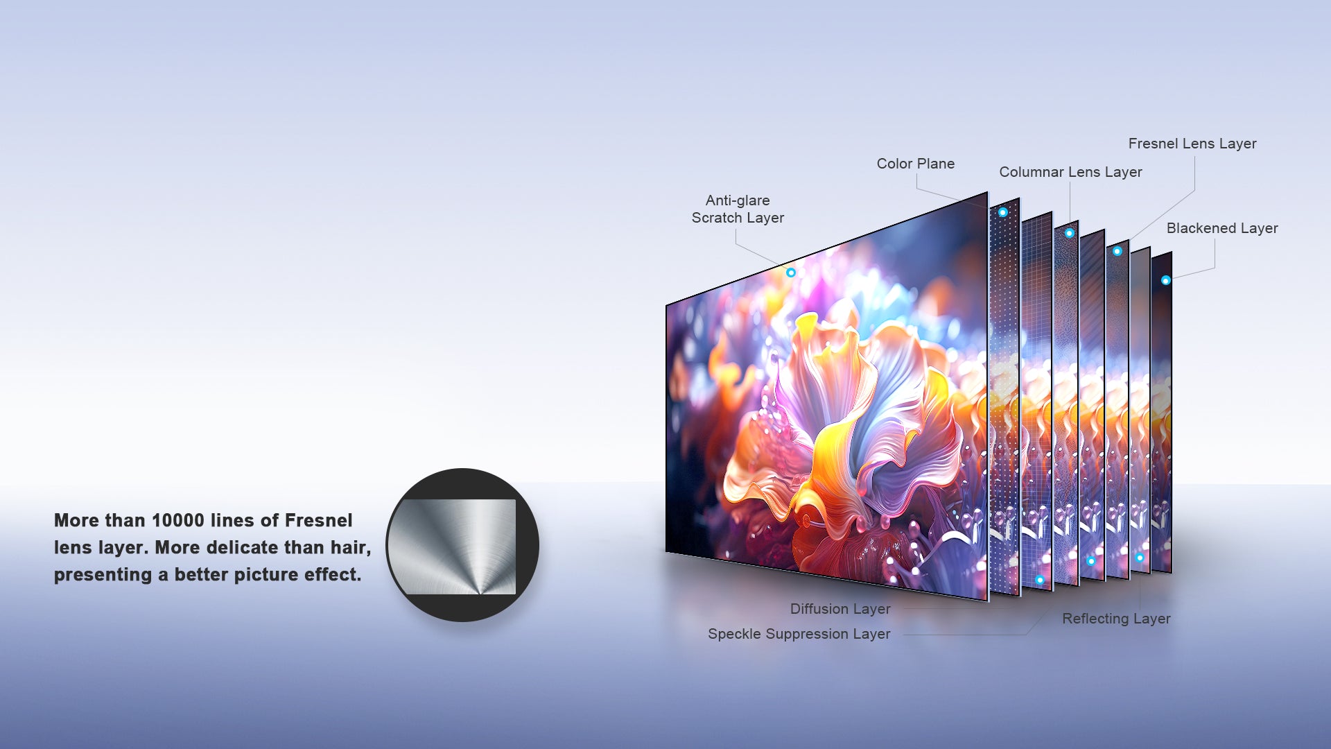 Experience enhanced brightness and true-to-life colors with our advanced eight-layer optical structure. This technology optimizes light paths, boosts image brightness, resists ambient light, and restores authentic colors for superior contrast and clarity.
