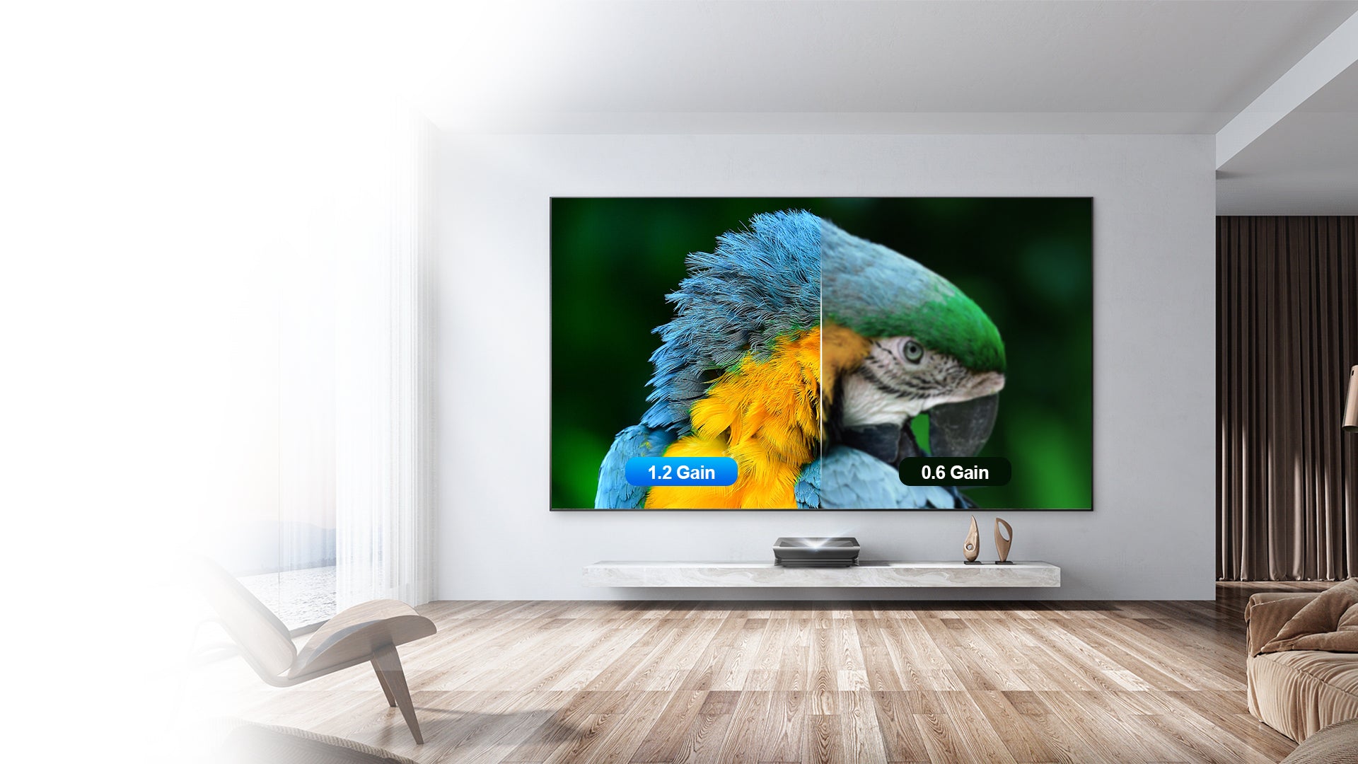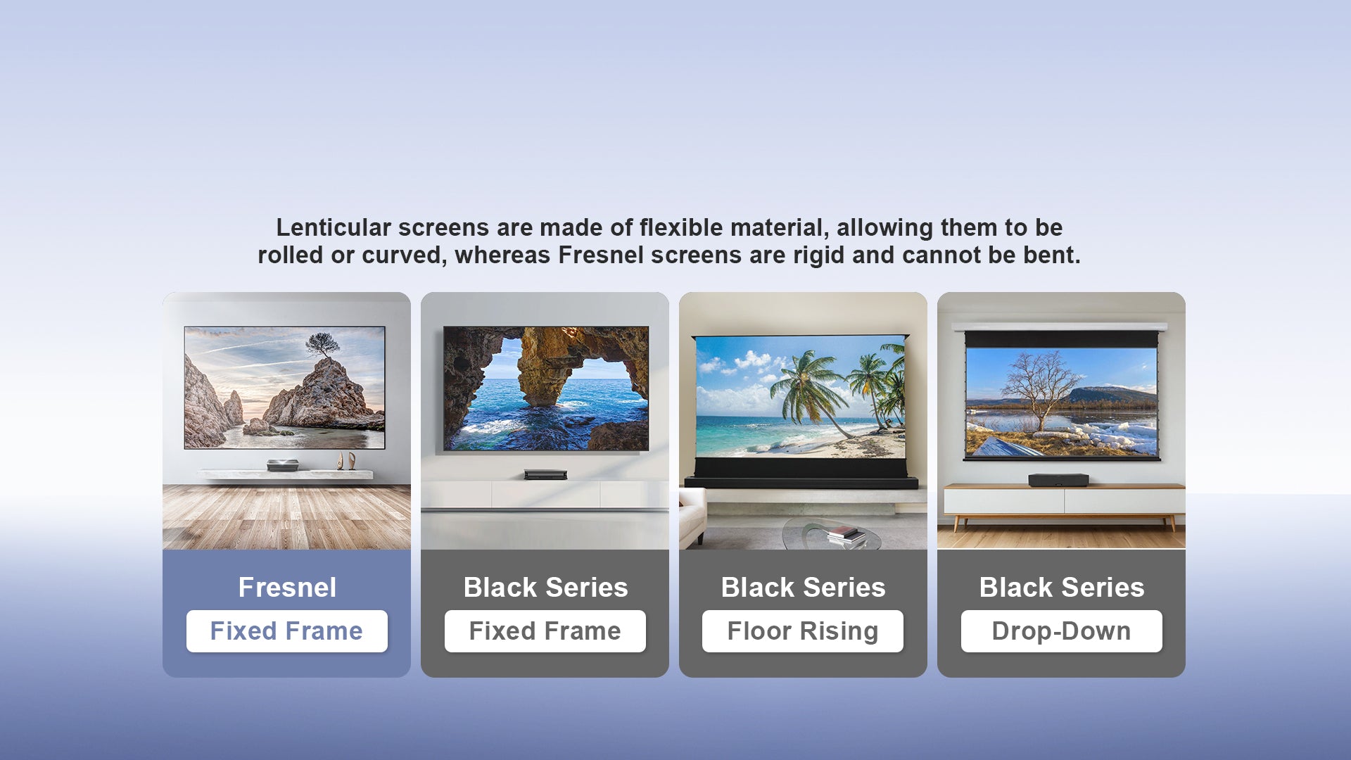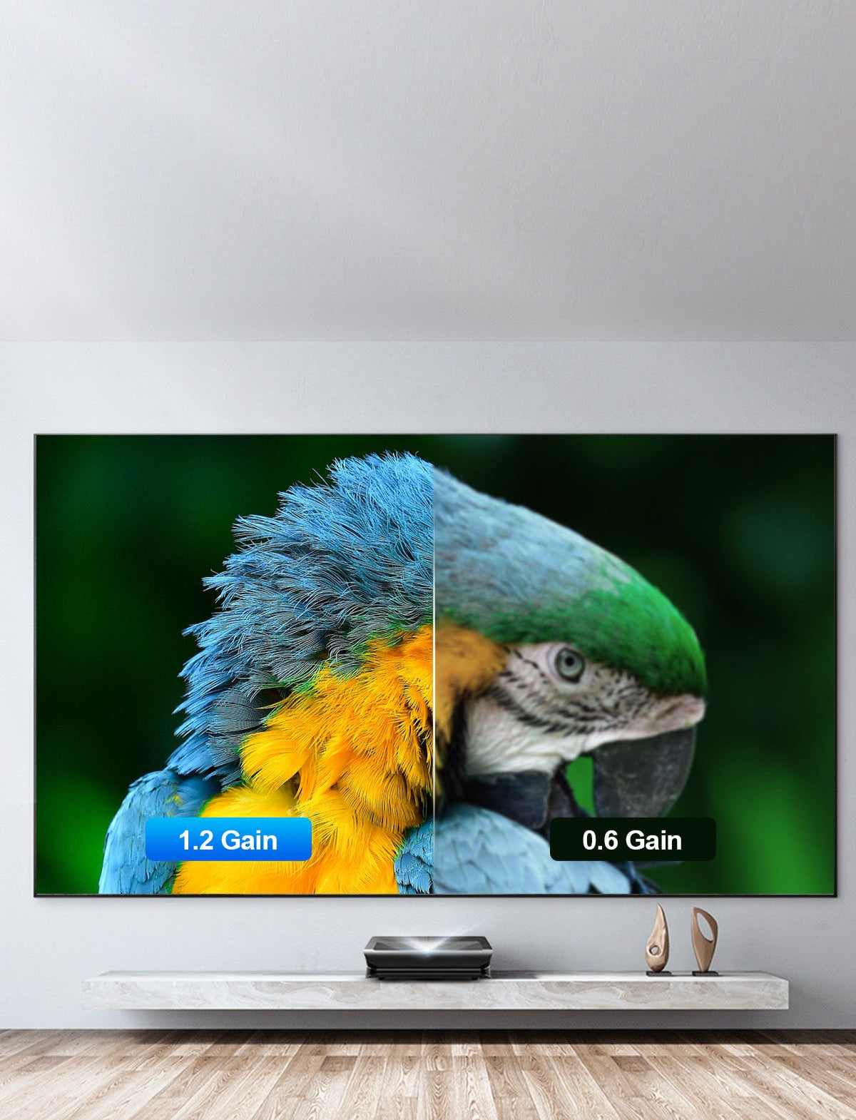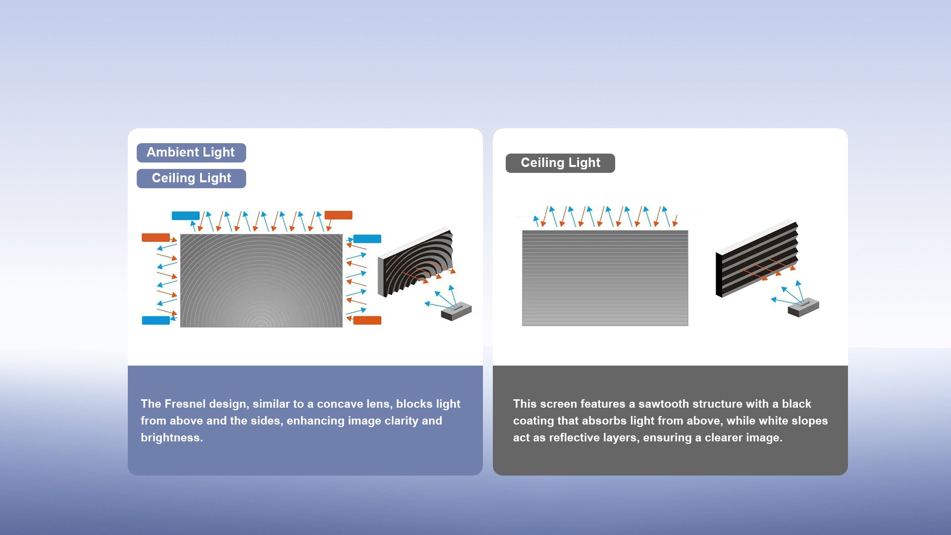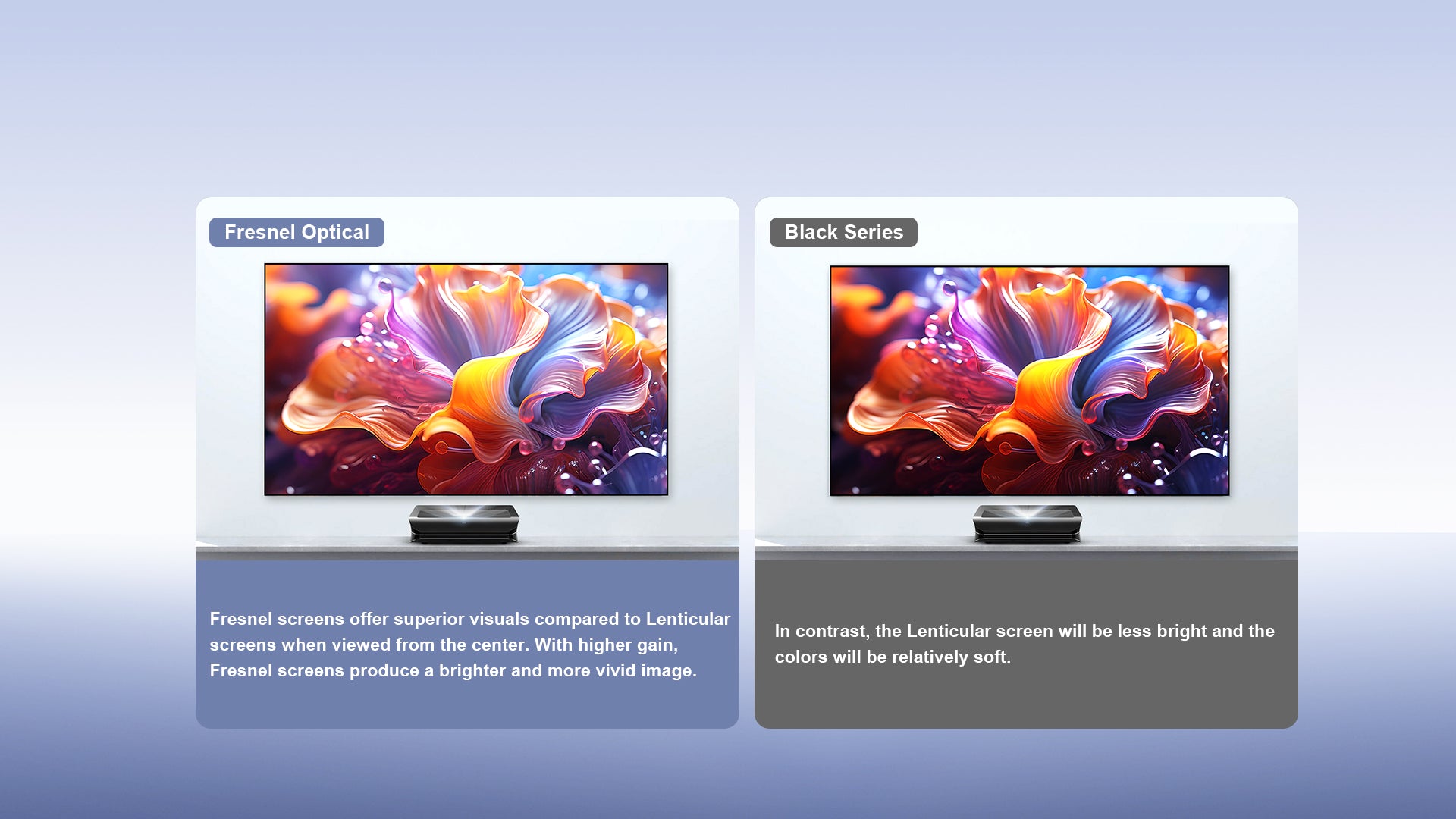 Featuring a 1.2 gain, our Fresnel ALR Screen delivers 50% higher contrast than comparable models—ensuring vibrant, lifelike colors even in bright ambient environments.