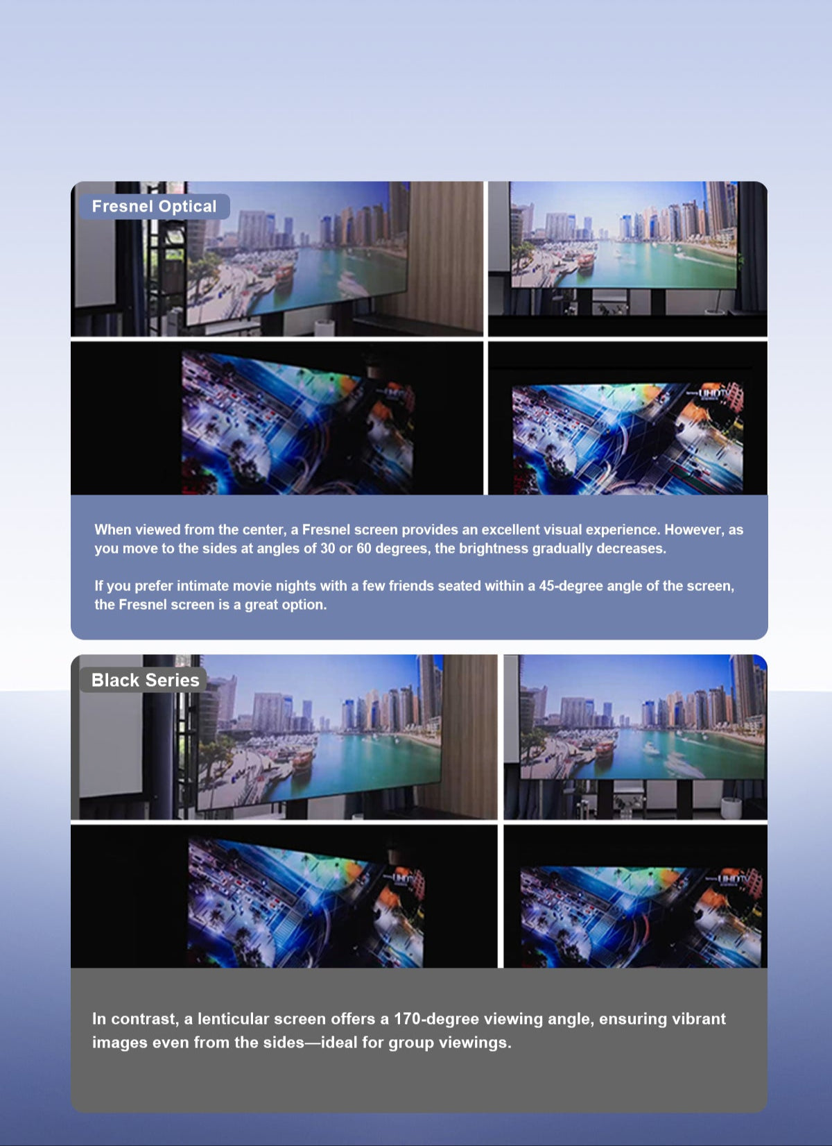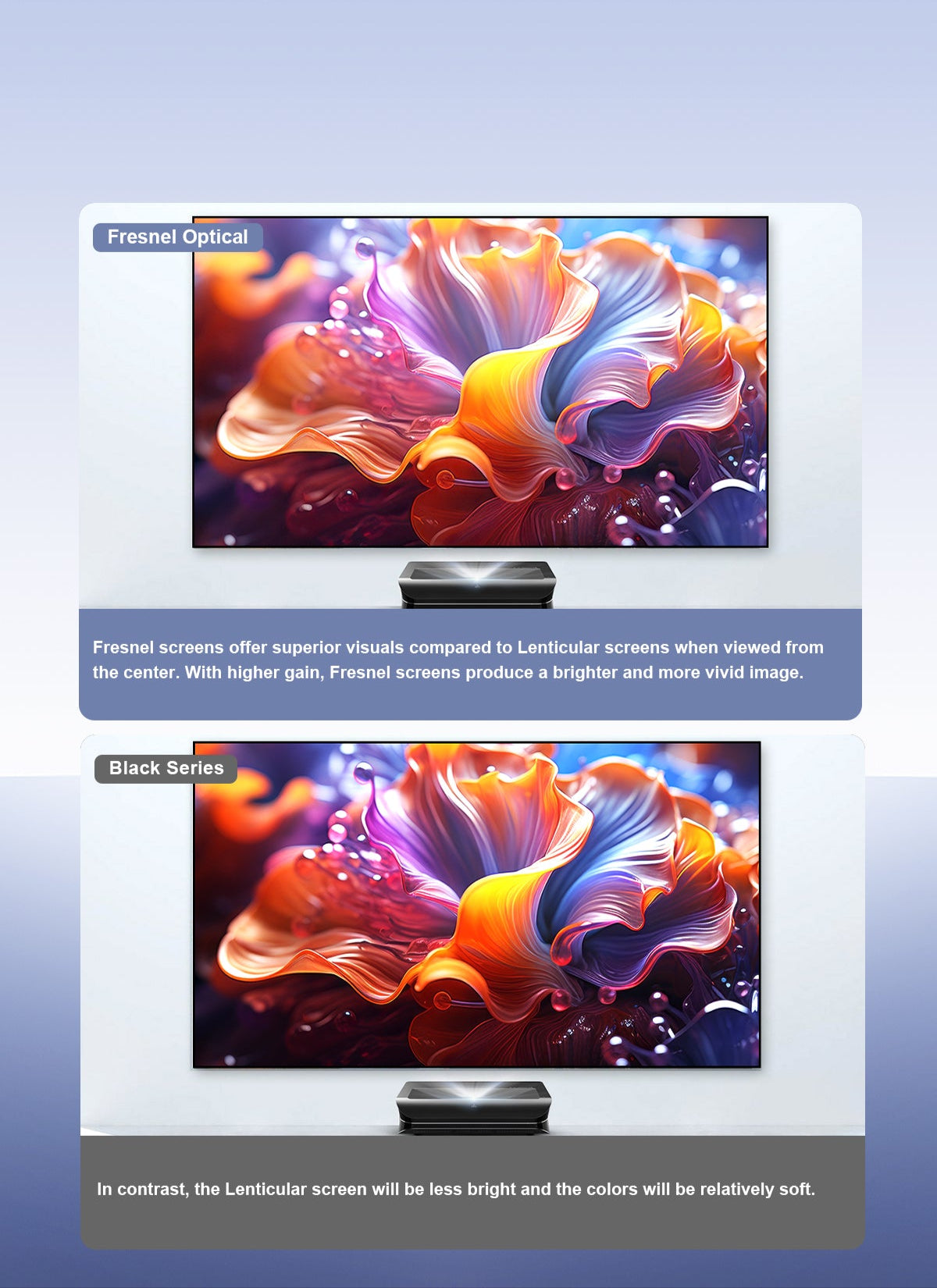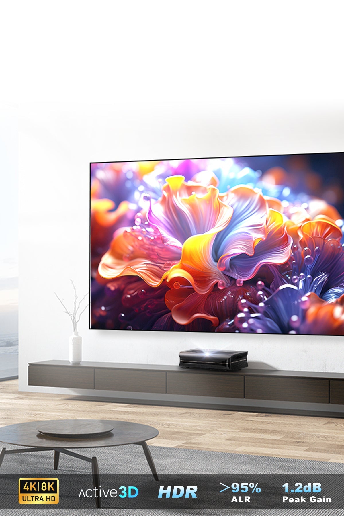 Fresnel ALR screen, specially designed for ultra-short throw projectors, delivers sharp and clear 4K visuals even in daylight.