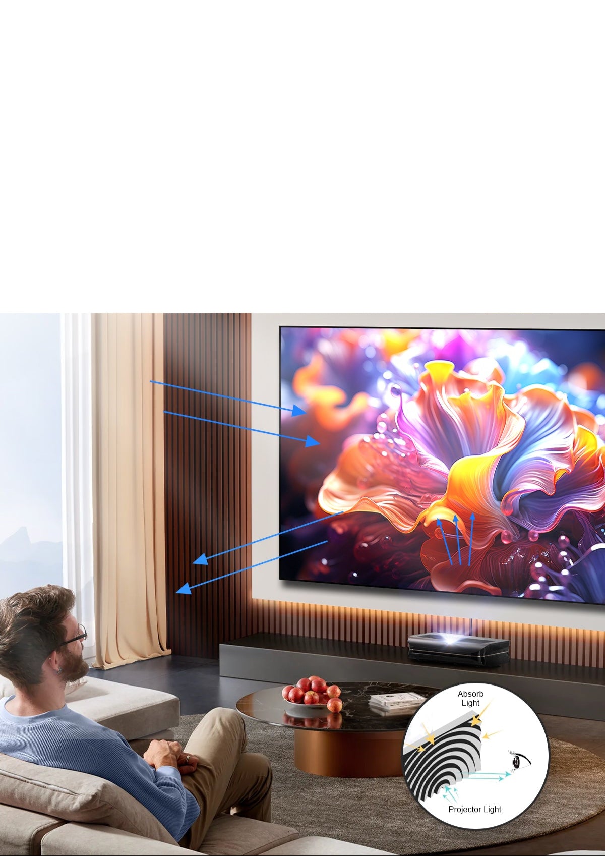 Enjoy Home Theater All Day. Using a special Fresnel optical structure, it effectively absorbs ambient light, focuses the projected light, and the semi-circular physical pattern on its screen surface can block more than 90% of stray light interference. It brings vivid colors and crisp images to your home, even during the day.