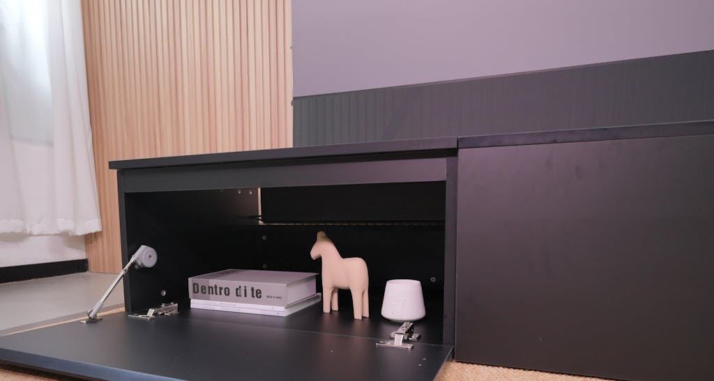 Tap your projector remote once – your cabinet instantly extends its platform in perfect sync with the laser projector. After viewing, it auto-retracts and vanishes flush into the cabinet. No waiting, no adjustments: pure cinematic readiness at your command.