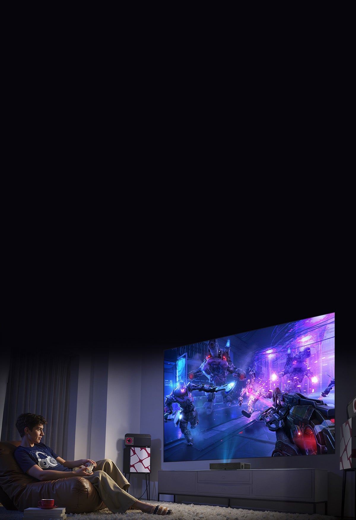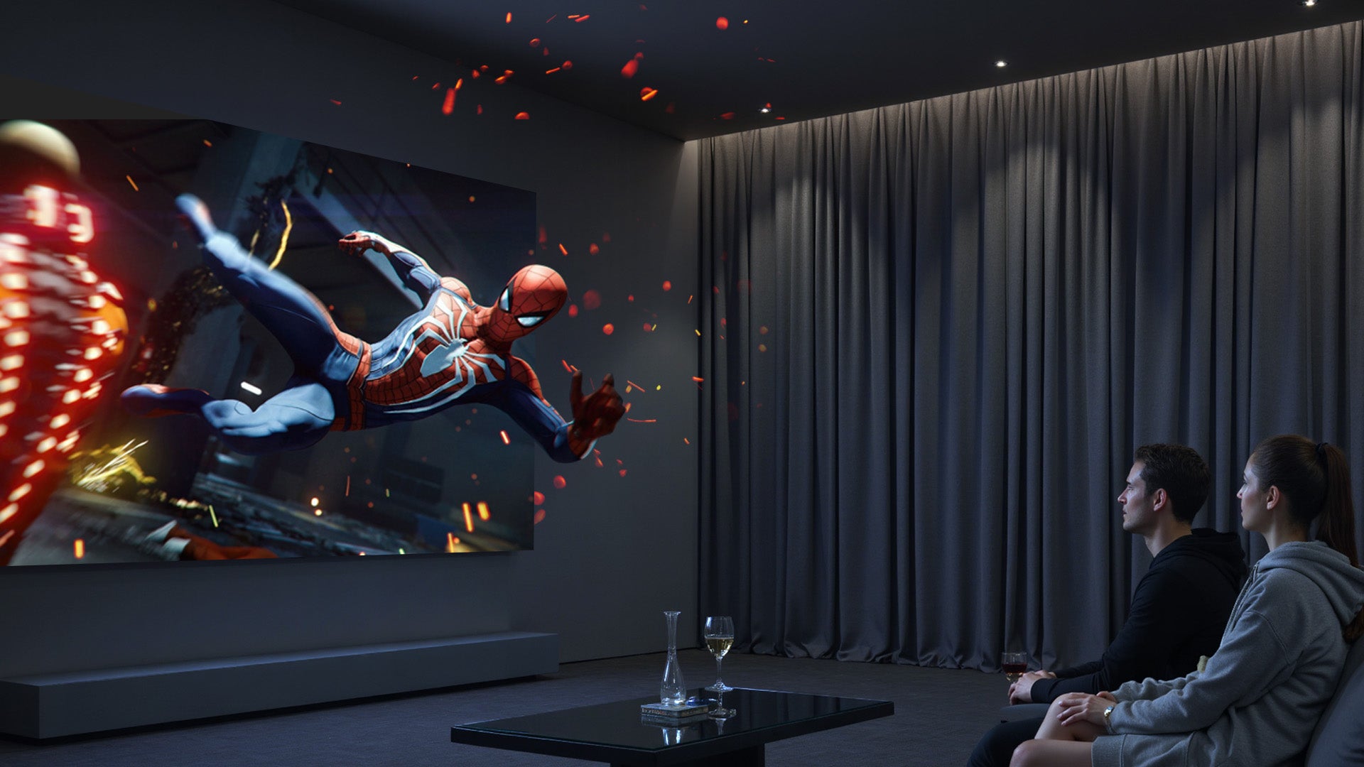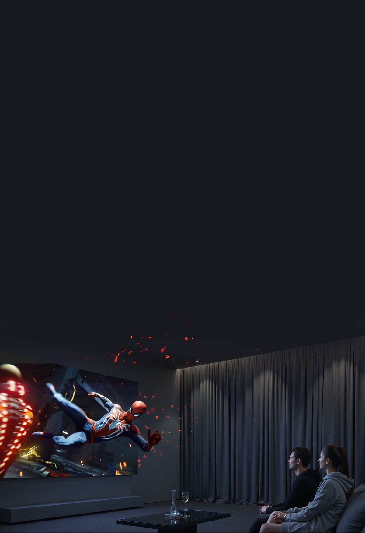 Dengan bezel ultra-nipis 1cm yang minimalis, skrin hampir rata dengan dinding anda, mencipta penampilan moden dan bergaya yang melengkapkan mana-mana ruang tamu atau teater. Apabila dihidupkan, ia hilang ke dalam gambar — seperti tingkap ke dunia lain.
