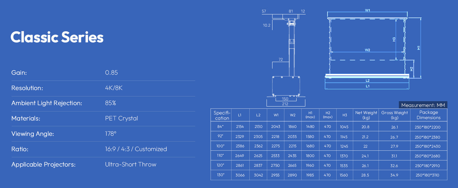 Skrin Naik Lantai Bermotor ALR 85% NothingProjector PET Crystal Classic 84''-120'' Untuk Projektor Ultra Short Throw