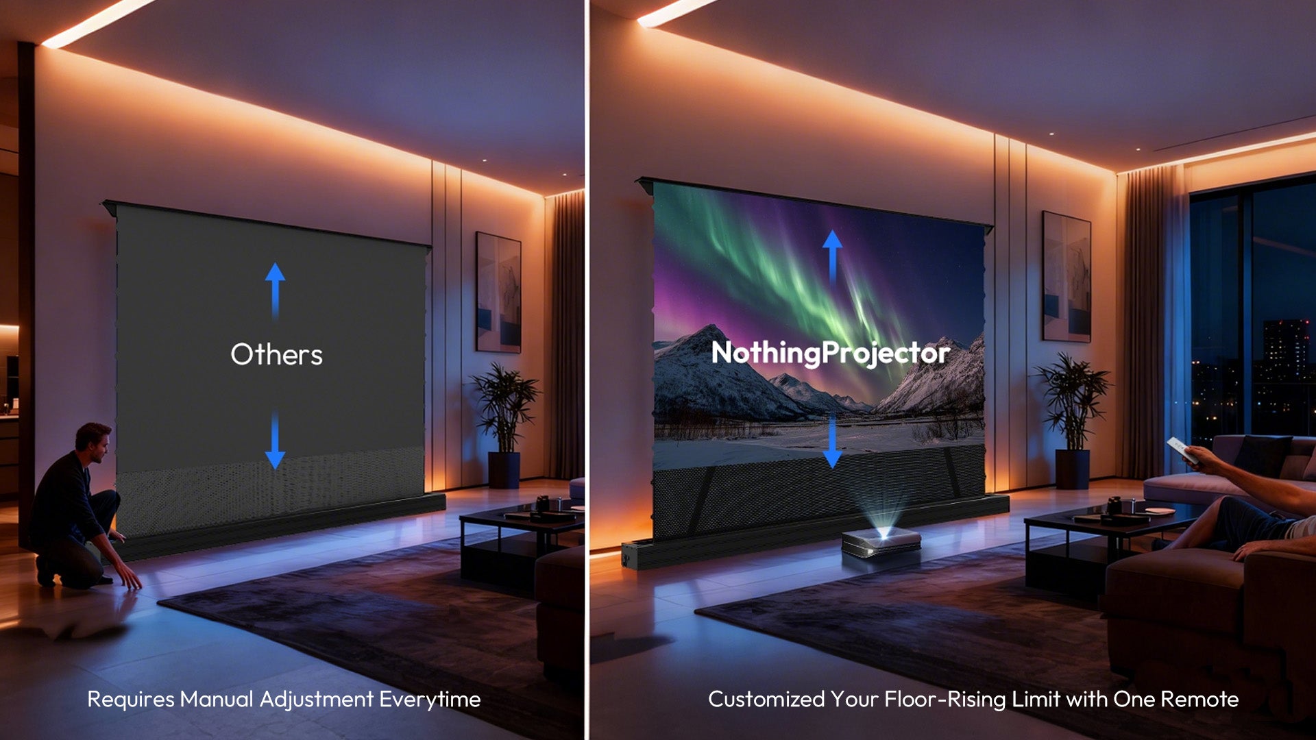 The floor-rising screen's maximum height has been preset at the factory. Please do not adjust it beyond this limit. If higher adjustment is required, follow the instruction manual carefully or contact customer service for a guided video before proceeding.