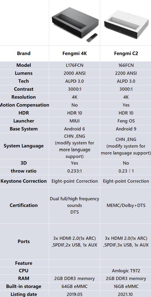 Så Fengmi C2 er den nyeste mellomklassemodellen med 4k-skjerm fra Fengmi. Fengmi 4k er den eldre modellen.