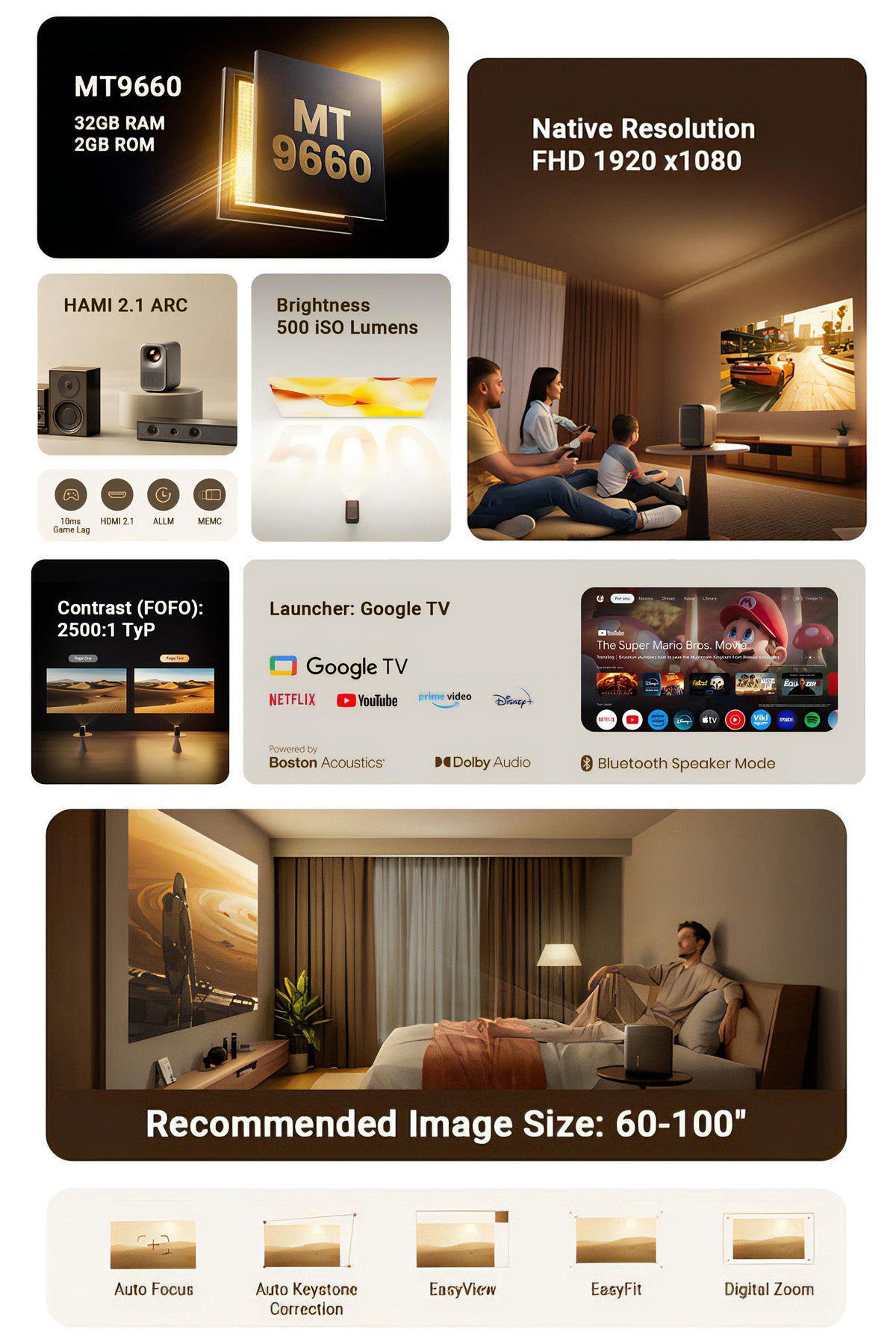 Wielofunkcyjne inteligentne kino domowe. Ulepsz swoje doświadczenia wizualne z Formovie Xming Page Two. Zaprojektowany, by wyeliminować skomplikowane konfiguracje i plątaninę kabli, ten projektor łączy ostre wizualizacje, wysokiej klasy akustykę i nieograniczone możliwości streamingu w jednym eleganckim urządzeniu. Niezależnie czy to wieczór filmowy w ogrodzie, czy responsywna gra, rozrywka na dużym ekranie nigdy nie była tak prosta.