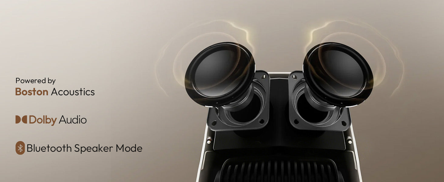 Ciesz się w pełni immersyjnym dźwiękiem bez bałaganu dodatkowego soundbara. Współprojektowane z ekspertami akustyki z Boston Acoustics i wzbogacone przez Dolby Audio, wbudowane głośniki dostarczają czyste wysokie tony, zrównoważoną dynamikę i potężne basy, które ożywiają filmy, dialogi i muzykę.