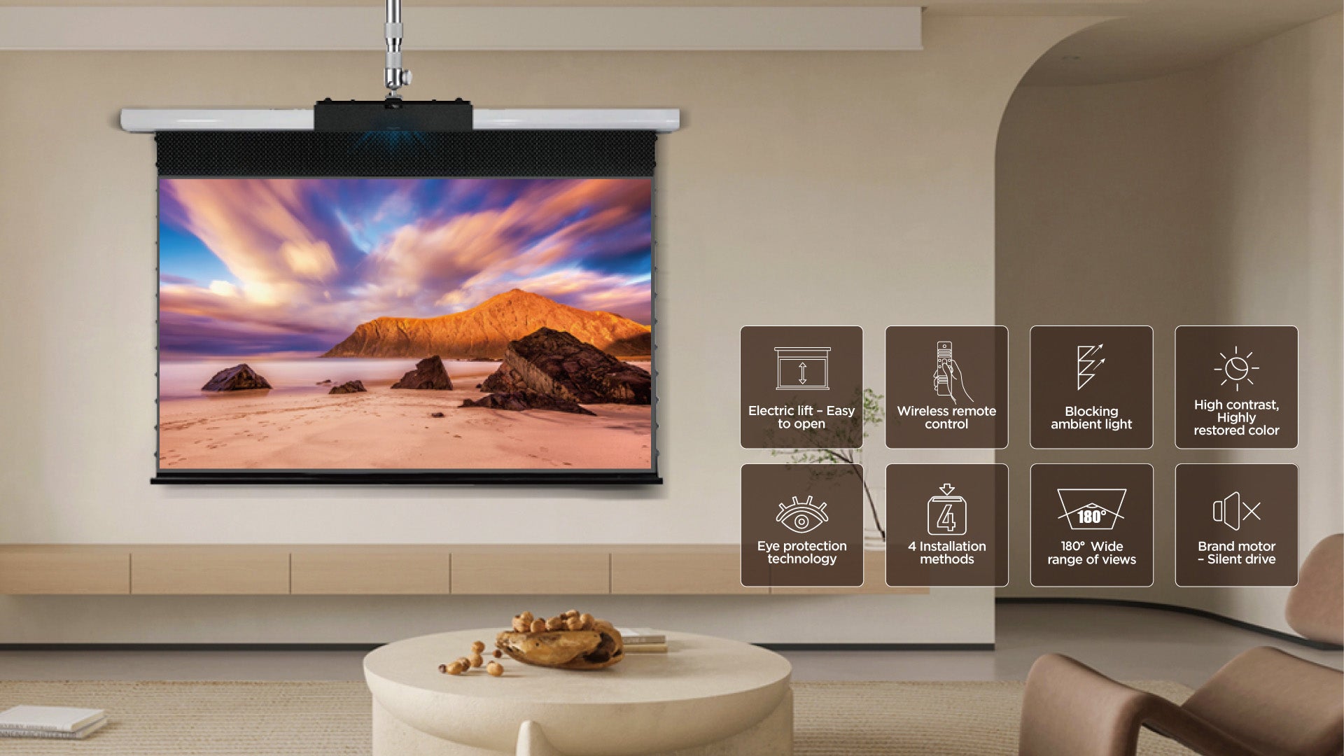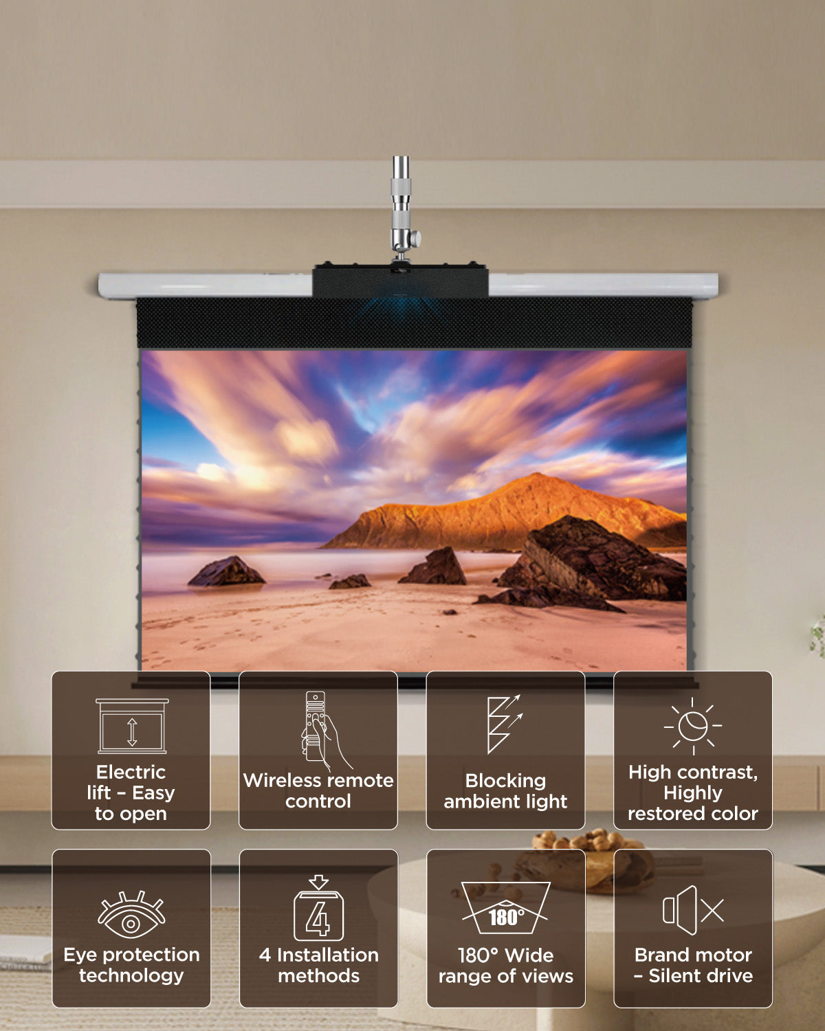 Enjoy smooth, mirror-flat visuals every time. The tab-tensioned rope system keeps the screen perfectly taut, while the silent tubular motor ensures a whisper-quiet operation. A full electric lift system retracts the screen into its sleek aluminum housing when not in use — clean, compact, and stylish.