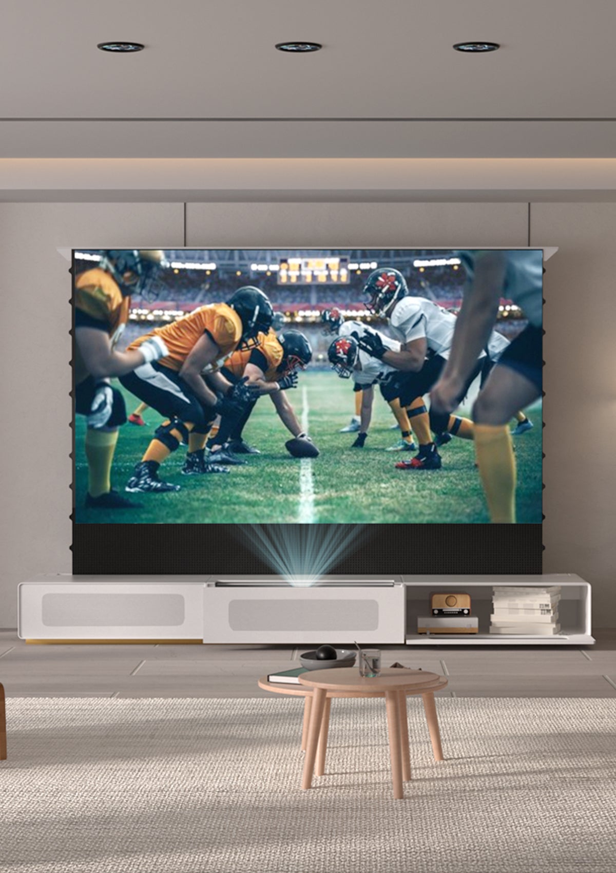 【Funcție inteligentă】Panoul telescopic motorizat se sincronizează cu proiectorul printr-o singură atingere, aliniind automat ecranul cu o memorie de poziție precisă care elimină reajustarea.
