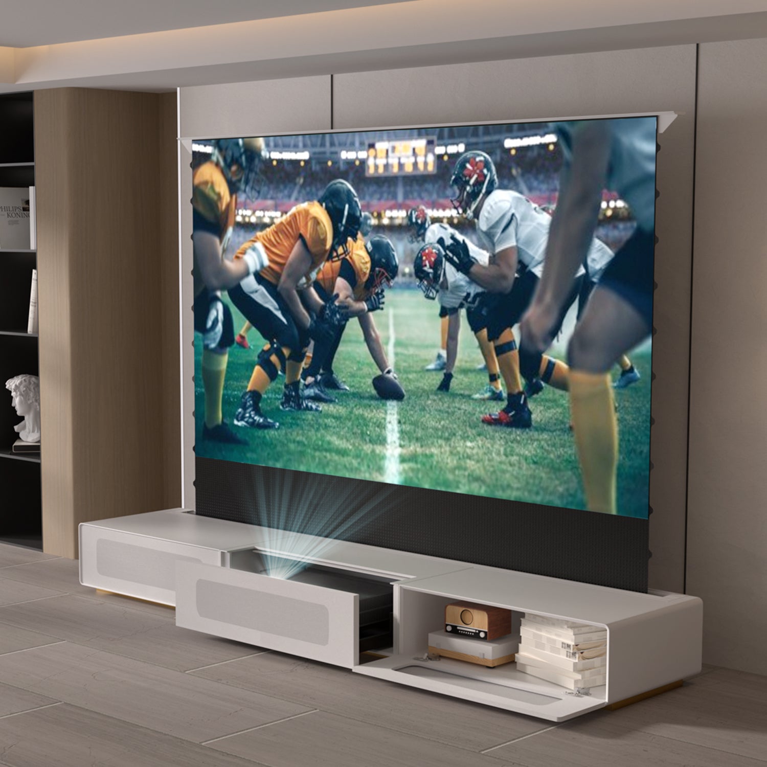 Le meuble Home Cinéma Shore incarne la solution intégrée ultime : il dissimule élégamment un projecteur UCF et un écran CLR motorisé géant (jusqu'à 3,05 m) dans un design sobre, offrant une image au contraste exceptionnel grâce à la technologie de réjection de lumière parasite, même en ambiance Lumineuse. Son Automatizare Ingénieuse Sincronizați d'Une Simple Touche L'Ouverture du Tiroir, l'llumage du Projeur et le déploiement Parfait de l'Ecran, Avant d'Opérer sa disparition magique en 30 secunde après la Séance, ne Laissant Qu'un Discret Meuble Bas Décorataratif.