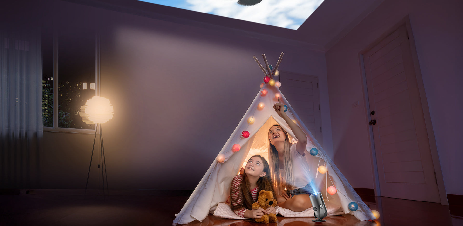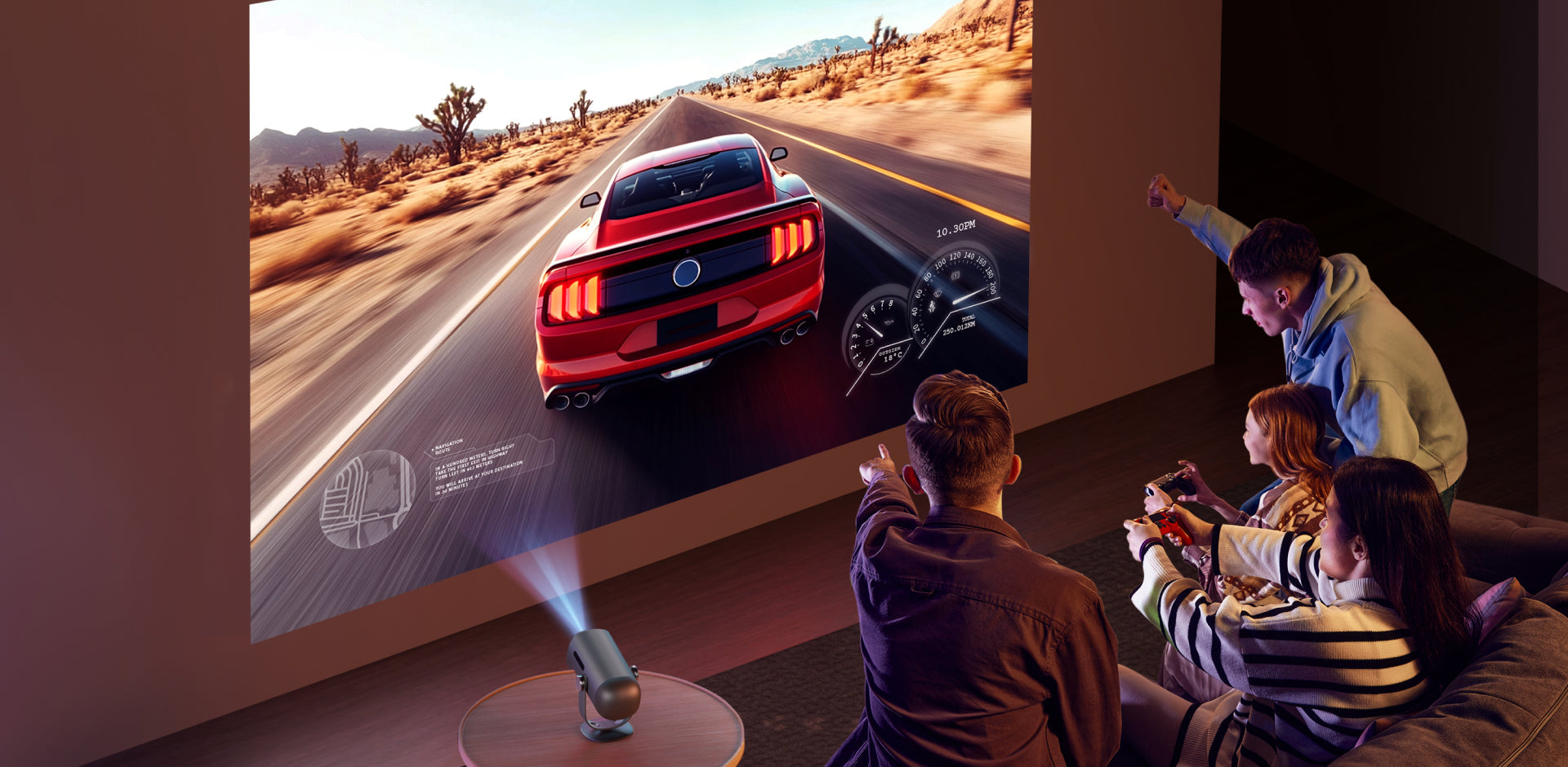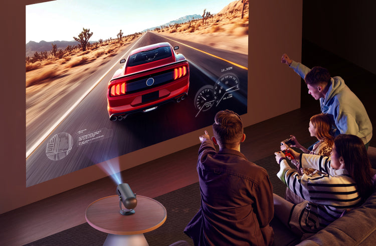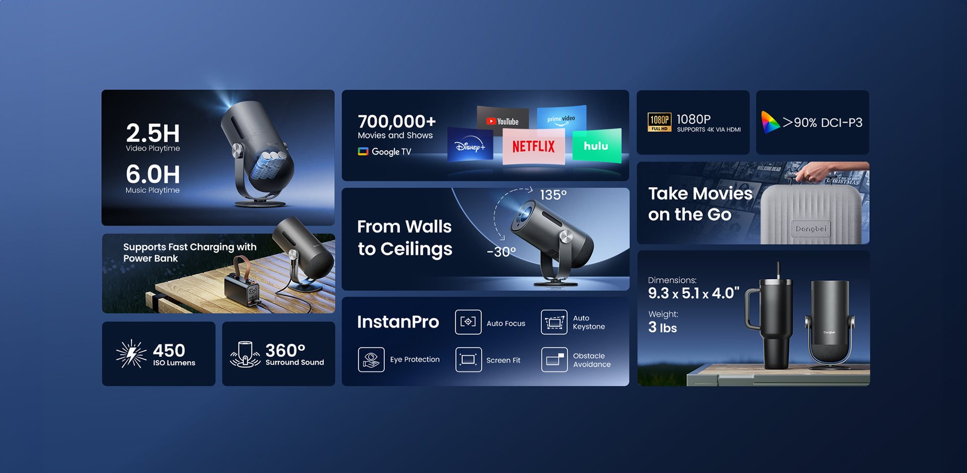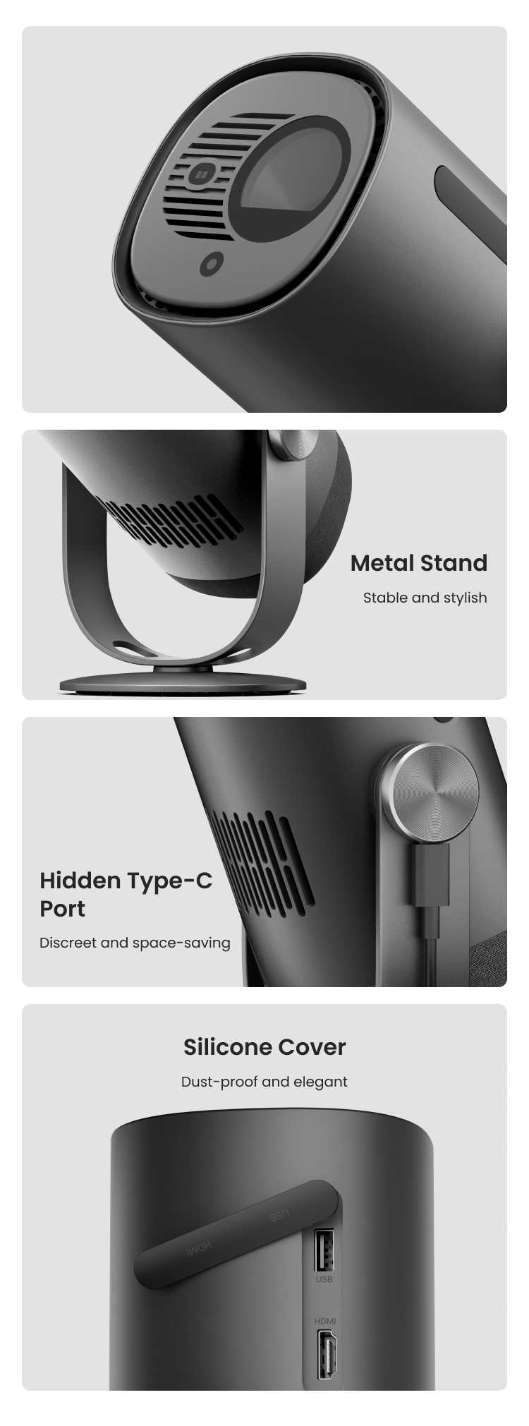- Superbærbar kino: Slipp løs med vår aller første ultraportable projektor! Se en 2,5-timers film eller fest hele natten med musikk på én lading. Kompatibel med powerbank.
