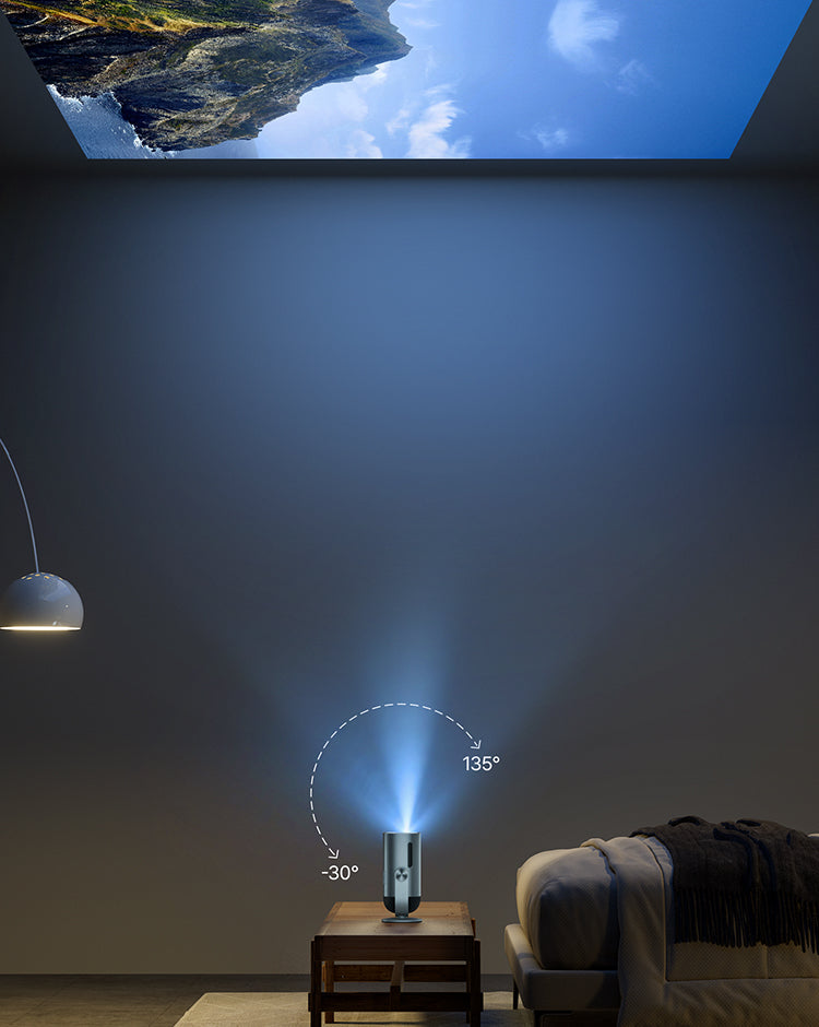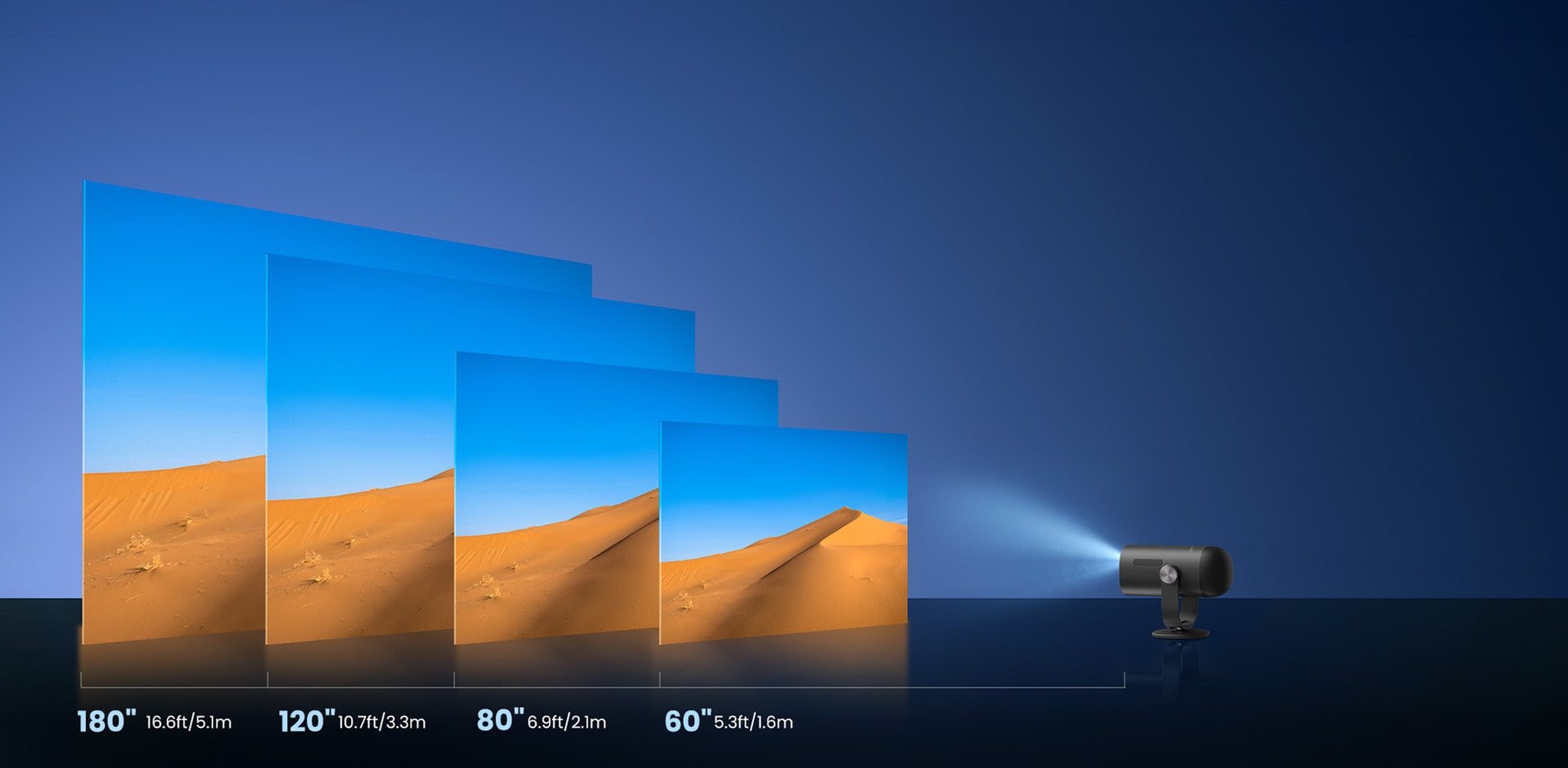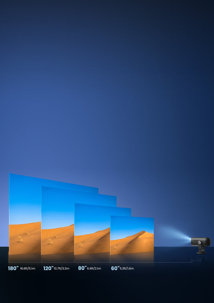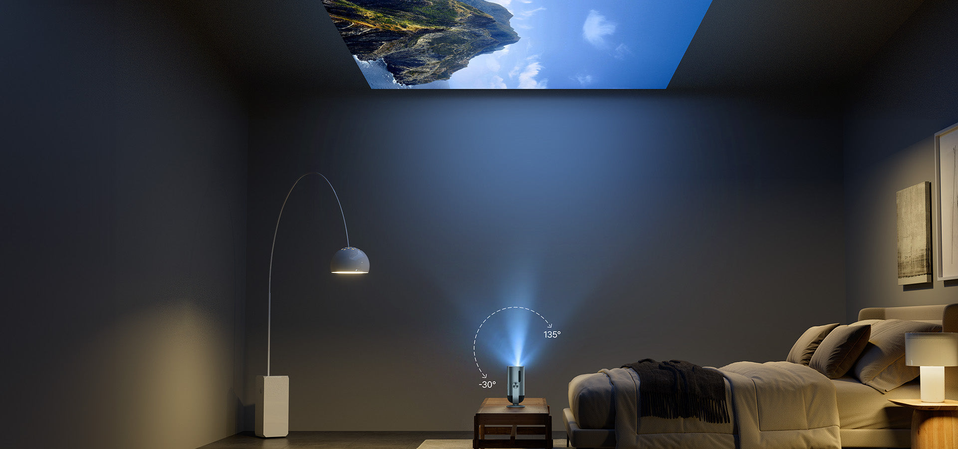 - Stor vinkel, stor størrelse: Projiser hvor som helst fra vegger til tak med det integrerte 165° vidvinkelstativet, og alle størrelser fra 40" til 180" for enhver plass.