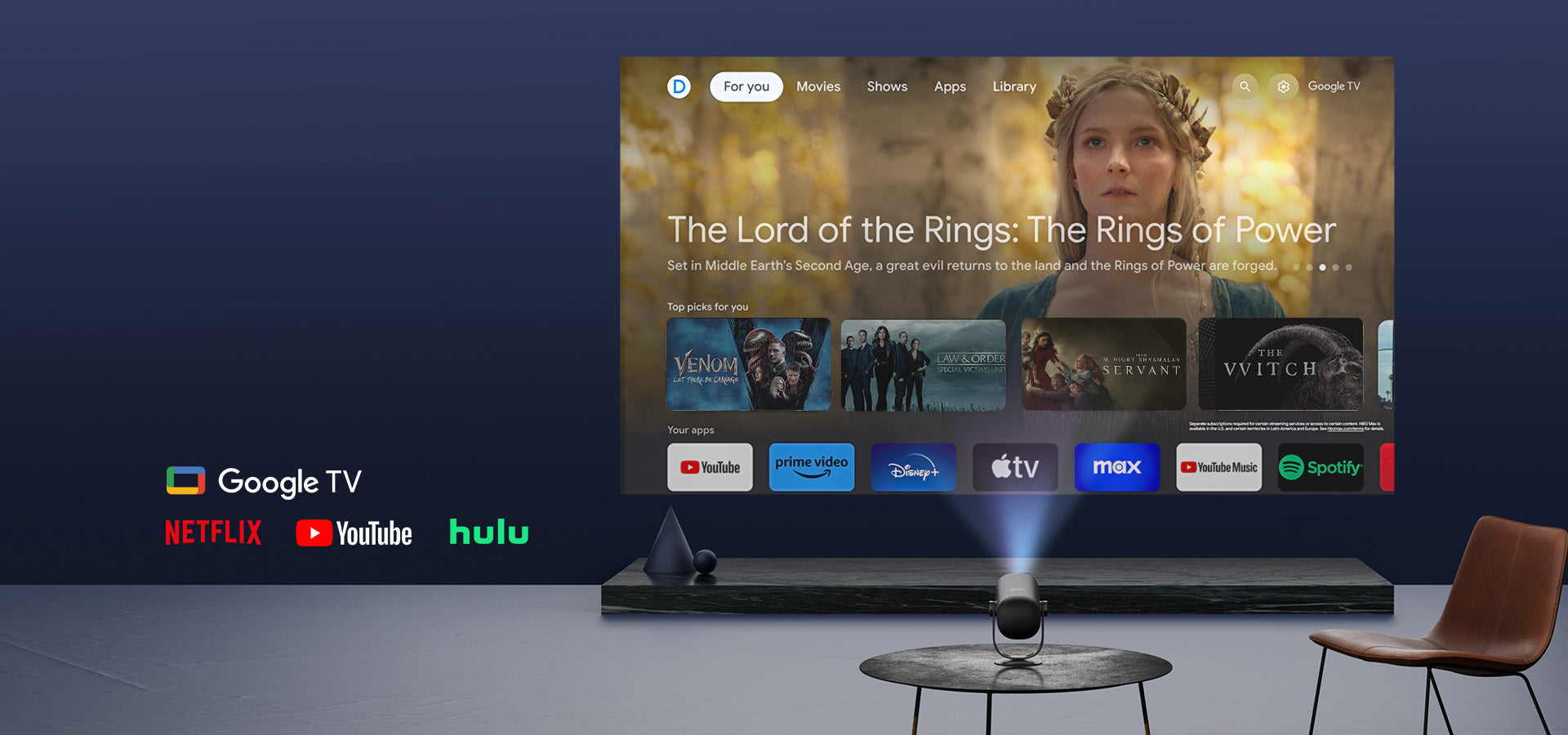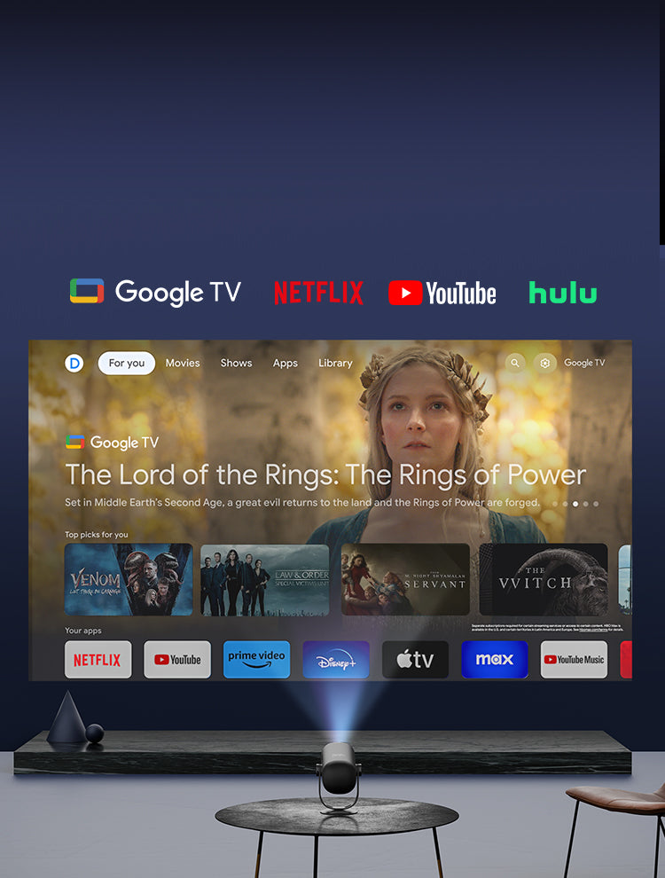 - Google TV og lisensiert Netflix: Over 700 000 filmer og serier venter! Nyt offisiell Netflix, enkel casting og stemmekontroll – alt innebygd i denne utendørs filmprojektoren.